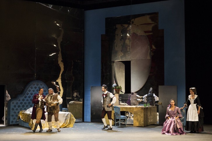 La mise en scène de Tobias Richter, également directeur du Grand Théâtre de Genève, raconte bien l'intrigue. Si elle reste dans la tradition « strehlérienne » peut-être qu'une lecture plus attentive de ce chef d'œuvre de la mise en scène lui aurait évité quelques erreurs. Comme celle du jardinier Antonio entrant chez le Comte par la fenêtre d'où avait sauté Cherubino, posant ses bottes crottées sur la coiffeuse de la Comtesse, et portant dans ses bras, la preuve du délit, un impeccable pot de géraniums alors que le livret affirme que Cherubino avait foulé une plate-bande d'œillets (un clin d'œil de Lorenzo Da Ponte à la superstition théâtrale ?)