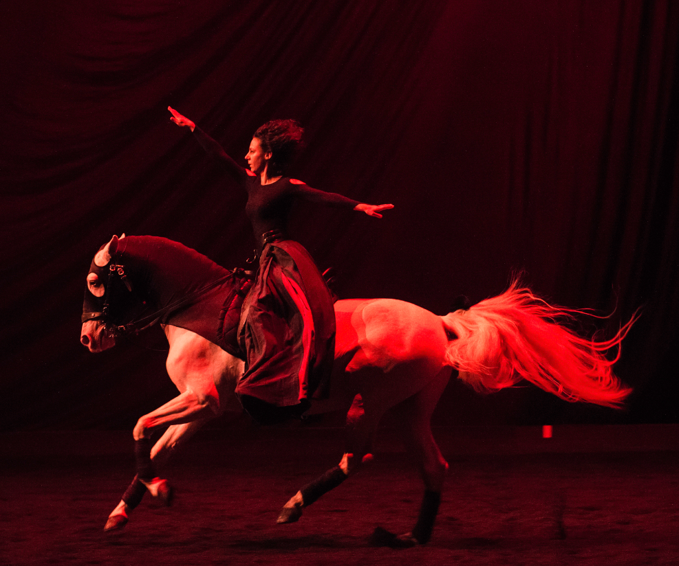 C'est d'abord le Miserere en la mineur qui résonne, œuvre méconnue mais magnifique d'un Mozart de quatorze ans, qui venait sans doute d'entendre celui d'Allegri. Dans la pénombre, un splendide cheval noir et son cavalier qui n'est autre que , entament une valse hypnotique autour de la figure chrétienne du martyre. Soutenue par les éclairages de Bertrand Couderc, cette première vision se révèle saisissante dans ce tableau mystique quasi surnaturel.