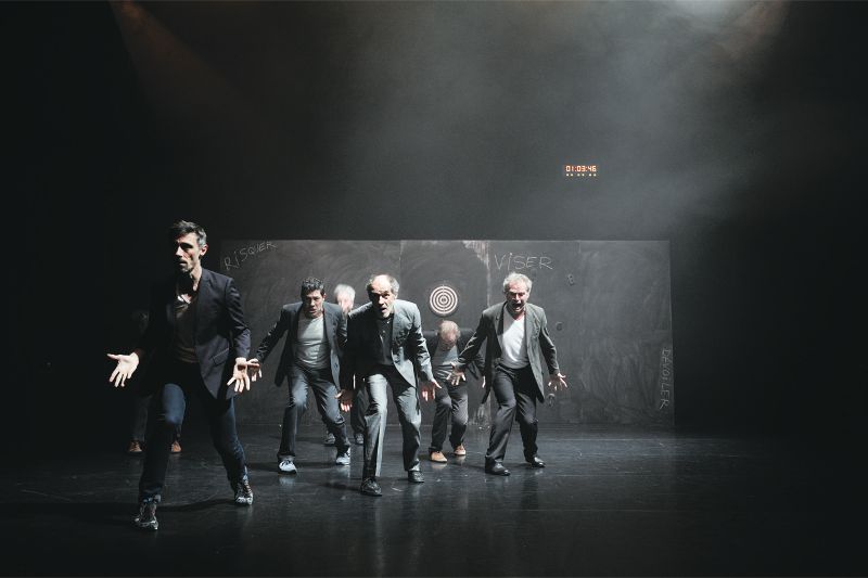 La pièce s'ouvre sur sept hommes, t-shirt moulant et cheveux grisonnants. Le public entre de manière presque indiscrète au cours d'une partie de fléchettes entre copains. Les joueurs tournent le dos au public mais bientôt, la musique commence, les dos font alors place aux torses, les corps se mettent en mouvement et le décompte de l'horloge est amorcé : 1h15 de spectacle, pas une minute de plus.