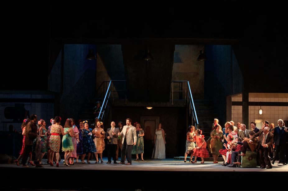 Walter Sutcliffe ne joue pourtant pas tant que cela sur l'opposition entre un idéal de pureté concrétisé par les montagnes espagnoles (retranscrit également par un solo magnifique de clarinette en début et fin de prologue), et la perversion des basses terres : les sommets pyrénéens sont vite souillés par un sac plastique alors que les mauvaises herbes envahissent le moulin en béton. Le metteur en scène choisit plutôt de mettre l'accent sur notre volonté à vouloir implacablement contrôler le monde, la nature comme les hommes. Cette mise en scène un brin austère porte toutefois bien le drame et les sentiments qui composent cette histoire : la fierté, la jalousie, la soumission face à un diktat, la révolte, et enfin, évidemment, la puissance de l'amour. Pour les décors, tout en sobriété, Kaspar Glarner ne manque pas d'ingéniosité en offrant une multitude de possibilités de déplacements et de positionnements du chœur comme des solistes, entre cette montagne vierge en hauteur que seul un cadre nous laisse apercevoir, et ce moulin en béton où la pièce principale est accessible par quatre escaliers savamment disposés. Les costumes renforcent le contexte réaliste et populaire de l'intrigue et sont dictés par des fautes de goût nécessaires (le costume de cérémonie de Pedro doit être évidemment particulièrement hideux, puisque celui-ci le refuse), alors que les couleurs, inspirées de l'univers cinématographique d'Almodóvar, restent en cohérence avec l'Espagne et dynamisent la vision d'ensemble dans un décor plutôt sombre.