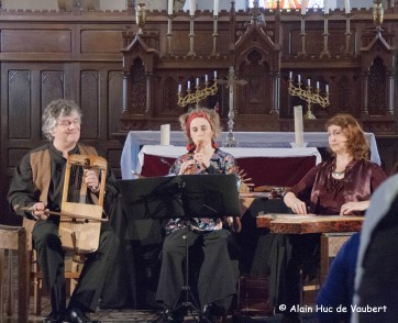 Changement d'atmosphère le lendemain après-midi avec l'ensemble Obsidienne dans la modeste église du prieuré d'Ardevon, à un jet de pierre du Mont Saint-Michel. Avec leur instrumentarium aussi riche qu'insolite, Emmanuel Bonnardot, Florence Jacquemard et Hélène Moreau ont évoqué le chant des pèlerins et des trouvères à travers les miracles, les troubadours, les exils, les pèlerinages, les saisons et les amours en expliquant qu'au Moyen Âge, sacré et profane sont proches, voire mêlés. La femme est au centre de chaque chanson strophique, mais qu'il s'agisse de chanson à danser, chanson de toile, d'aube, de croisade, pastourelles, reverdies, l'amour que l'on porte à sa dame se mêle souvent à celui que l'on voue à la Vierge Marie.