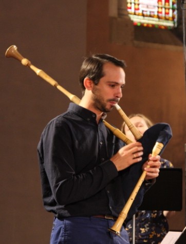 Après avoir entendu harpe et flûtes jouer les oiseaux, on retrouve la voix pure et belle de Marie Remandet dans Credidi, un psaume pour la Fête-Dieu. Toujours de la musique naturelle, vivante, qui donne envie au public de se joindre aux chanteurs. Les pièces se suivent, les musiciens bougent, se rejoignent, s'allient, toujours avec cette simplicité qui laisse passer la chaleur de cette musique parfois sacrée, parfois populaire. Cela permet, par exemple, de découvrir des instruments rares, tel le cervelas, un ancien instrument à vent, à anche, de la famille du basson que le musicien, Krzysztof Lewandowski, a eu plaisir à expliquer à la fin du concert. Quant à Tiago Simas Freire, outre la direction discrète de l'ensemble, il joue, au fil du programme, de la flûte, du cornet et de la gaïta, la cornemuse portugaise, bien sûr. Un musicien aux talents multiples qui poursuit, en parallèle, un parcours universitaire de haut niveau. Les années qui viennent sont prometteuses…