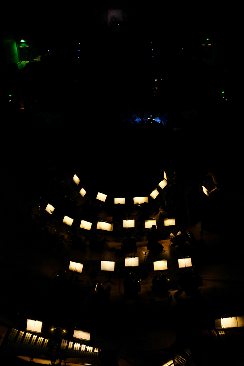 Haas nous conduit donc dans un dédale de plus d'une heure grâce à une œuvre composée en 2000 et créée à Graz en 2001 par Sylvain Cambreling et son Klangforum Wien. À Paris, en ce vendredi de novembre, le chef américain Erik Nielsen, directeur musical du Théâtre de Bâle depuis la saison passée, conduit vingt-quatre instrumentistes de l'Ensemble Intercontemporain avec une rigueur et une maîtrise de battue qui n'occultent pas pour autant une véritable identité du rendu, notamment dans sa clarté. La pièce débute par les cordes, le piano et deux percussionnistes sur xylophones puis se développe avec de longues variations à l'ensemble, notamment les bois (flûte, flûte basse, hautbois, clarinette, clarinette basse, basson et saxophones) ainsi que quatre cuivres (cors et trombones par deux).