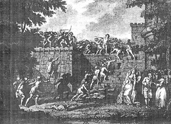 Richard Cœur de Lion, assaut donné par les troupes de Marguerite à l'acte III. Gravure de Claude Bornet (1786). Bibliothèque nationale de France, département Musique.