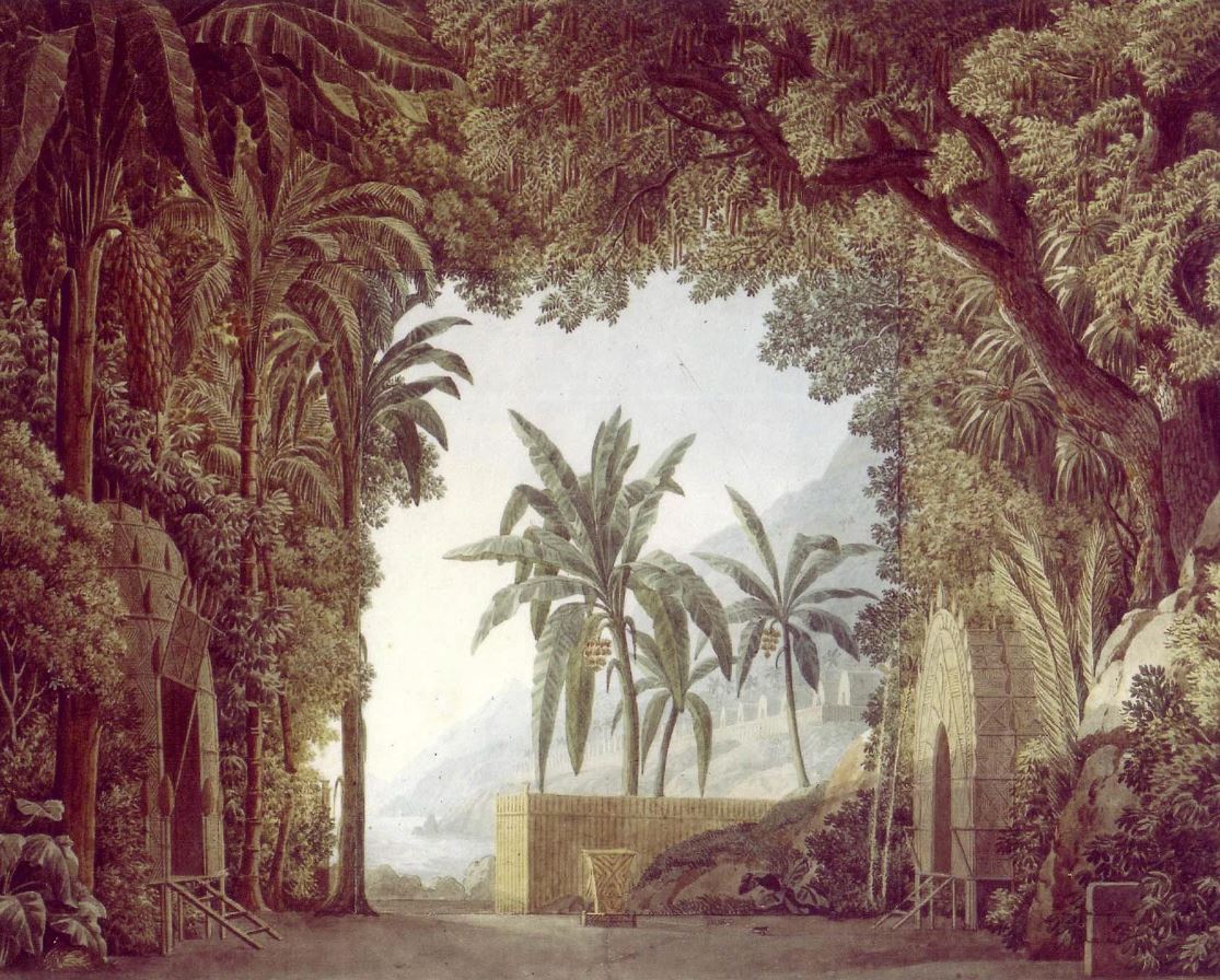 La perspective du décor de l'acte I de Paul et Virginie de Le Sueur est moins structurée. A part une corbeille en osier, le centre du plateau est vide. Les habitations à droite et à gauche, disposées comme pour le décor de Richard Cœur de Lion, paraissent rudimentaires. La toile au fond de la scène est peu détaillée mais cela ne rend pas ce décor moins exceptionnel. Selon la maquette de Charles Percier, les arbres et les palmiers atteignaient le plafond du théâtre. De même les buissons et la composition florale semblaient luxuriants et riches de différentes sortes de variétés botaniques. Si cette iconographie est conforme au décor découvert sur scène à cette époque, le public ne pouvait être qu'époustouflé par la beauté et la qualité de ce travail.