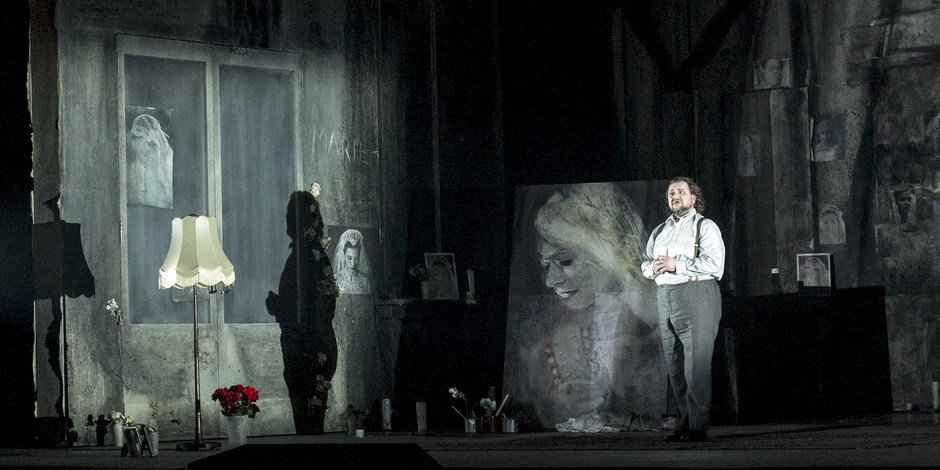 Comme souvent chez les metteurs en scène contemporains face à cet opéra, Bösch y cherche avant tout la noirceur issue du roman Bruges-la-Morte et présente avec le décorateur Patrick Bannwart une grande pièce aux murs abîmés, mausolée de Marie. Le sol froid et nu et son matelas dans un coin pourraient presque faire penser à une scène de bohème, mais très vite les vidéos viennent exposer des images fantomatiques et des reproductions du portrait de Marie présent sur scène devant nous. Afin de maintenir l'incertitude sur la situation face à l'apparition d'une Marietta physiquement identique à Marie, puis face au fait que certaines parties seront ensuite rêvées ou réelles dans le livret, Bösch et son dramaturge Stefan Ulrich font étrangler Marie par Paul une première fois dès la fin du premier tableau.
