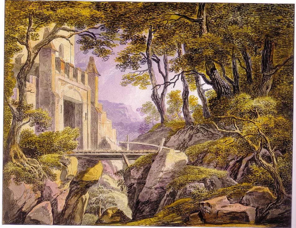 Le projet de décor du théâtre royal de l'Odéon pour la représentation de Richard Cœur de Lion de Grétry est ainsi un bon compromis. Le Roi d'Angleterre est vu sur le balcon de sa cellule. L'opposition entre l'emprisonnement du héros et sa liberté est soulignée par la forêt derrière les murailles. La découpe binaire avec deux tours à chaque côté du plateau est également présente.