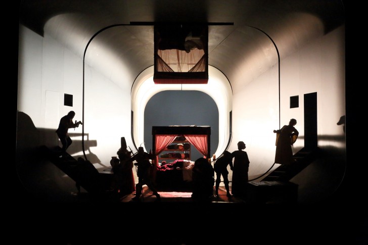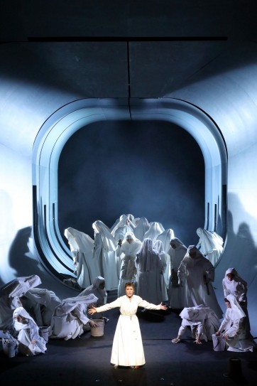 À Munich, cette deuxième nouvelle production de la saison après des Noces de Figaro honorables ne renouvellera pas notre approche de l'œuvre de Puccini, tant le travail de l'artiste Lotte de Beer est conventionnel, au décor près de Bernhard Hammer, juste fait pour paraître moderne, à la façon du vaisseau spatial de la récente Bohème parisienne. Comme l'a demandé le compositeur, le rideau s'ouvre avant que la musique ne commence, et l'on découvre un massif couloir face au public, qui laisse apparaître au loin une lumière dans la brume, sorte de tunnel vers la mort dont ressort le cercueil de l'enfant trop vite parti de Giorgetta.