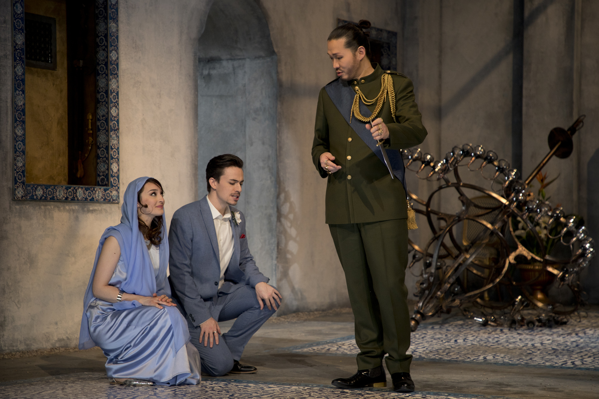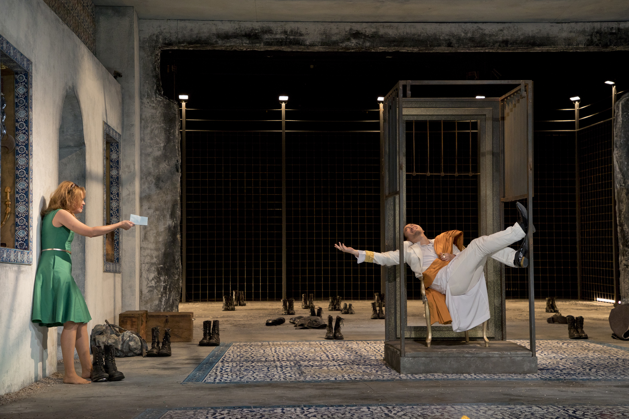 Pour clôturer sa série septennale consacrée chaque hiver à l'opéra napolitain dans le théâtre rococo du château de Schwetzingen, le théâtre de Heidelberg fait un détour par Londres : c'est pour l'Opera of the Nobility, monté pour concurrencer l'entreprise de Haendel, que le Napolitain Porpora a créé ce Mitridate en 1736, avec une équipe de choc à sa disposition : Farinelli, Senesino et la Cuzzoni, rien de moins. Le livret lui en a été fourni par un comédien anglais dont les talents de dramaturge suscitaient les moqueries en son temps même : si on retrouve une partie des personnages de l'opéra homonyme de Mozart, l'intrigue en est très différente, et elle n'a aucun rapport non plus avec l'autre Mitridate composé par Porpora six ans plus tôt. Mithridate meurt certes à la fin de la soirée, et lui-même et ses fils s'y disputent l'amour de deux nobles dames : là s'arrêtent les similitudes. Le livret ne parvient pas à construire une trame dramatique cohérente au-delà de l'accumulation d'épisodes successifs et, il faut bien le dire, rend la tâche du metteur en scène à peu près impossible : Jacopo Spirei en prend acte et se contente d'une mise en place plutôt élégante et esthétique, dans une atmosphère de palais oriental – la première entrée de Mithridate, dévoilé par les parois du fond de scène, immobile sur son trône, joue efficacement du topos du tyran oriental, mais c'est à peu près le seul vrai moment de théâtre de la soirée.
