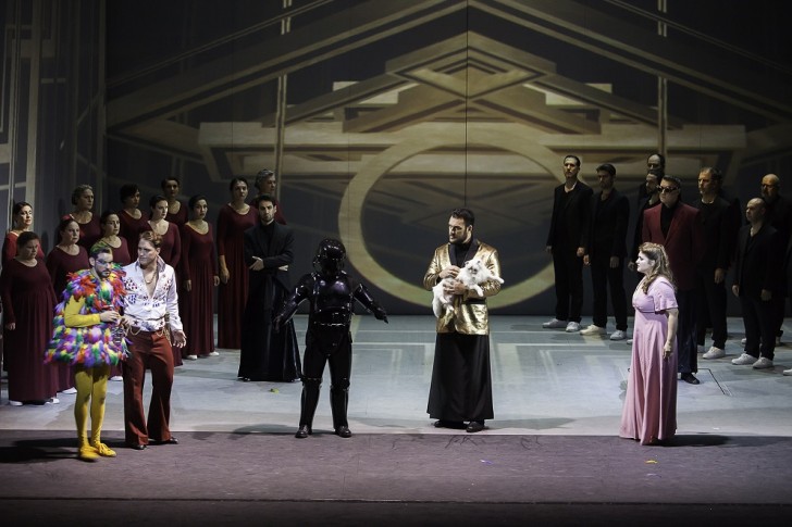 La Bohême spatiale conçue par Claus Guth a alimenté bien des réveillons. De quelque bord que l'on se situe, on rend les armes devant sa beauté visuelle et la logique de sa direction d'acteurs. Rien de tel hélas avec cette Flûte du joueur René Koering (que l'on ne remerciera jamais assez d'avoir permis que le King Arthur aussi désopilant que réussi du « trandem » Benizio/Niquet ait pu voir le jour) qui fait passer Tamino du statut de prince à celui de King : Presley soi-même à qui il fait mouliner de grands accords sur sa guitare électrique sur le swing de l'Ouverture, guitare qui réapparaît sur le chœur final dans les mains d'un Sarastro aussi soudainement qu'inexplicablement tenté par l'aventure rock, un Sarastro parfaitement inoffensif alors que la note d'intention nous l'avait vendu en grand maître de la finance. Entre-temps, on aura vu Pamina aux mains d'un Monostatos en Dark Vador au petit pied, entouré de trois C3PO. Le tout sur fond de gratte-ciels. Soit. Cet habillage rock'n'roll mis à part, gagne vite le sentiment d'une arnaque dramaturgique devant un déficit de sens difficilement tolérable de nos jours, une direction d'acteurs plutôt démissionnaire, hormis de rarissimes idées : les vocalises de son premier air transforment la Reine de la Nuit en Dominique Webb hypnotiseur de Tamino, la « chasse au Papageno » absolument pas tenté par les épreuves à venir en fin d'Acte I. C'est peu.