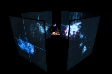Quatre écrans et pôles de diffusion sonore délimitent l'espace de projection au centre duquel opère l'artiste performer Alex Augier, seul aux manettes de son synthétiseur modulaire dans _ nybble_. Le titre, en anglais, désigne le chiffre quatre sur lequel repose la configuration structurelle de la performance. Image et musique sont en effet conçues à partir des mêmes données numériques, dans un travail que le compositeur qualifie d'organique et de synesthésique. « Mon idée, ma pensée est audiovisuelle » souligne-t-il. L'expérience perceptive à laquelle il nous convie ne saurait le désavouer, tant la cinétique, l'énergie, la projection spatiale voire les couleurs traversent tout à la fois le son et l'image. « Je me suis inspiré de la murmuration des oiseaux révèle Augier dans un interview conduit par Jérémie Spierglas. Gageons que ce méta-langage oiseau n'aurait pas déplu au rythmicien et ornithologue que fut Olivier Messiaen.