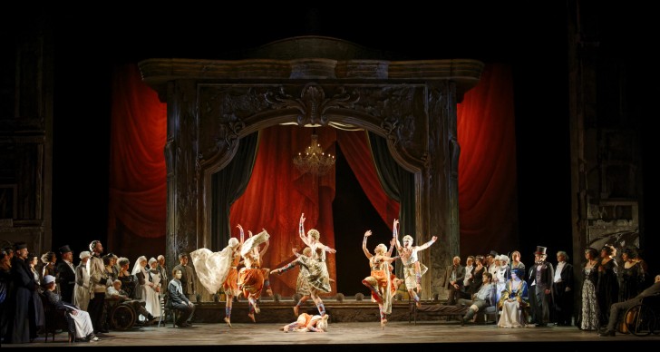 Battons notre coulpe en préambule : nous n'avions jamais pris très au sérieux cet avatar du vérisme, créé en 1902 entre Bohème et Tosca, certes bien écrit mais moins immédiatement inspiré que ses illustres modèles (malgré un prélude du quatrième Acte sur lequel Manon Lescaut pourrait mourir sans problème, Cilea est encore aujourd'hui à Puccini ce que Korngold a longtemps été à Richard Strauss.) C'est chose faite avec le spectacle très fouillé de Davide Livermore. Le metteur en scène italien creuse d'autres sillons que celui du suranné d'une énième rivalité amoureuse scandée par les effluves empoisonnés d'un bouquet de violettes (histoire pourtant vraie !). Avec une totale décomplexion, il annonce d'emblée la couleur de sa transposition temporelle : « Bienvenue en 1915 ! » envoie une énergique bande de fêtards avant le premier accord. S'enclenche alors la profusion d'un tourbillon d'images. Le cadre imposant (quasiment un arc de triomphe) d'un vieux théâtre, érigé sur une double scène tournante, s'ébranlant en cercles concentriques parfois autonomes, nous fait passer avec virtuosité de la scène à l'envers du décor en libérant la foultitude d'actions qui sont bien celles à l'œuvre dans le pile et face du monde du spectacle : cette Comédie Française d'un autre âge (1730) où triomphait la plus grande comédienne de l'époque, Adrienne Lecouvreur, mais aussi celle du début du XXe siècle où Sarah Bernhardt connut une célébrité aussi immense. 1915, c'est l'année où elle s'engagea comme infirmière de la « Grande Guerre ». C'est aussi l'année où elle fut amputée à 70 ans de la jambe droite. Le spectacle de Livermore a gardé la mémoire de tout cela, certes au prix de quelques contorsions temporelles (la Sarah amputée qu'il montre est à l'apogée de sa beauté, en condensé de tous les âges de celle qu'Hugo qualifia d'« Impératrice du théâtre ») mais qu'importe. On gagne un intérêt constant à cette leçon d'Histoire politique (images d'archives projetées sur la lèpre du cadre de scène, blessés soignés aux abords du salon de la Princesse de Bouillon) mais aussi artistique : l'Acte III allant jusqu'à nous gratifier, au cours d'un spectacle dans le spectacle, de l'intelligence d'un ballet tout sauf convenu dans sa résurrection des chorégraphies mythiques des Ballets russes, gestique nijinskienne à l'appui. Le décor accroche joliment les lumières crépusculaires de Patrick Bovey. Le charme des costumes hyper fouillés de Gianluca Falaschi interdit le regret de la poudre du Siècle des Lumières, parachevant l'évocation de ces mondes disparus que Cilea ressuscite dans son opéra et que Livermore propulse vers notre temps.