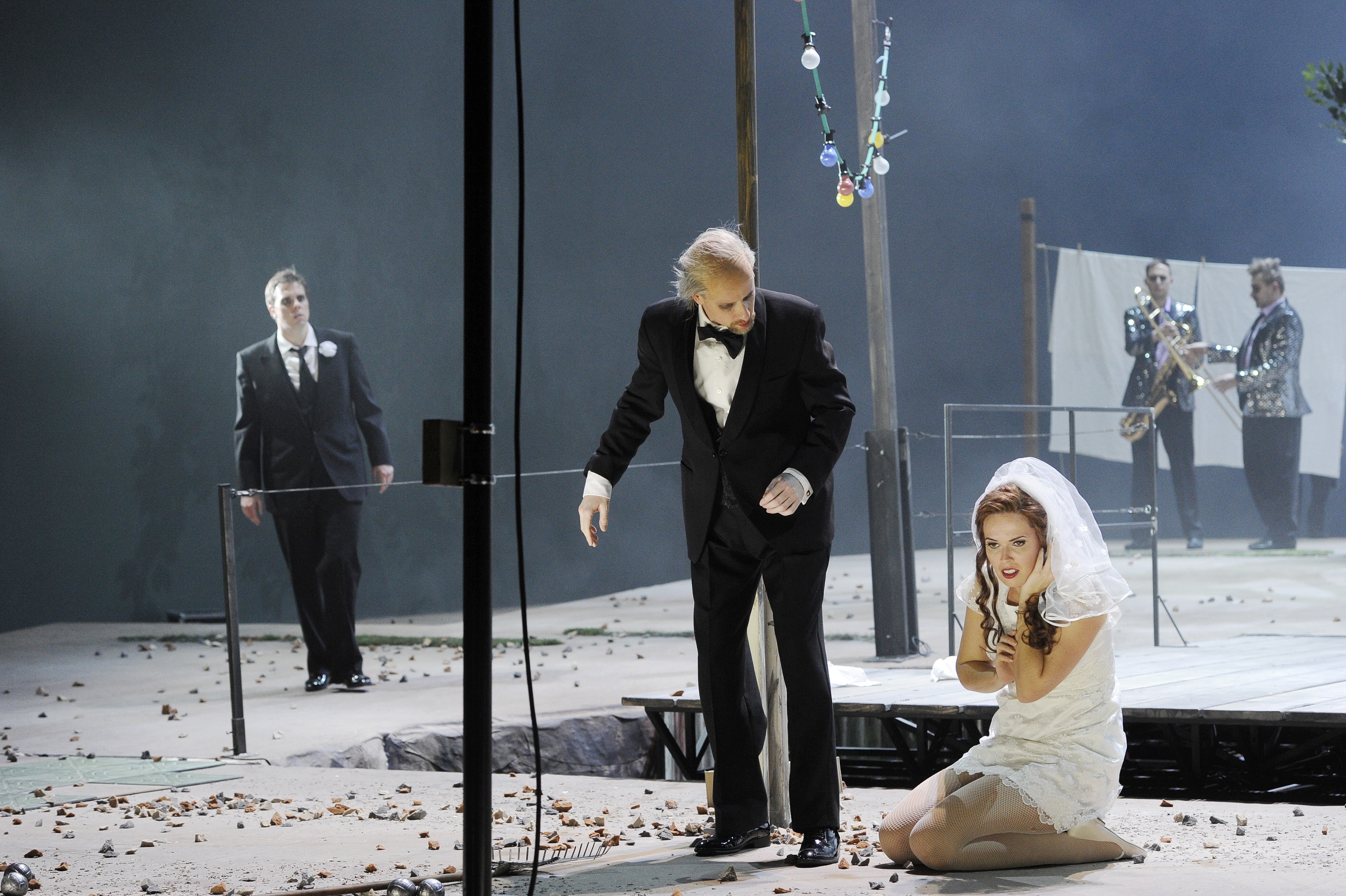 L'opéra du XXe siècle est une malle aux trésors, il suffit de fouiller un peu pour y trouver des joyaux : les multiples maisons d'opéra de la province allemande ne s'en privent pas, sans que cela ne chasse leur public. Ni vraiment inconnue, ni vraiment familière, La Tempête du compositeur suisse Frank Martin mérite bien qu'on s'y intéresse. Créée en 1956 à Vienne, issue de la plume d'un compositeur déjà sexagénaire nourrissant inlassablement son inspiration aux plus hautes sources littéraires, l'œuvre est très loin des avant-gardes de son temps, et on peut même lui trouver moins d'aspérités que dans les opéras de Britten, plus jeune que Martin d'une génération. La qualité suprême de sa musique, cependant, tient d'abord à la profonde sensibilité littéraire de Martin, qu'il partage avec Britten et qui donne aux mots de Shakespeare toute leur puissance d'imaginaire (on n'en dira pas autant de Thomas Adès, compositeur d'une plus récente Tempête tristement clinquante selon nous, mais réussie pour d'autres : Clef ResMusica pour l'enregistrement EMI). L'intensité philosophique de l'expérience mentale de Prospero, dont l'aboutissement est atteint dans le dernier monologue, celui du renoncement, montre cet art tout de simple expressivité et de confiance dans le mot chanté : on ne peut que penser à son œuvre la plus célèbre, les Six monologues de Jedermann, et penser aussi à Dietrich Fischer-Dieskau, pour qui le rôle a été écrit. Peter Schöne est d'un format plus modeste, mais il fait preuve d'un sens du mot et d'une éloquence très honorable : dommage seulement que le metteur en scène Lorenzo Fioroni fasse de lui à ce moment un vieillard brisé, alors que la renonciation de Prospero à la domination qu'il impose à la nature est faite au contraire en pleine possession de ses moyens.