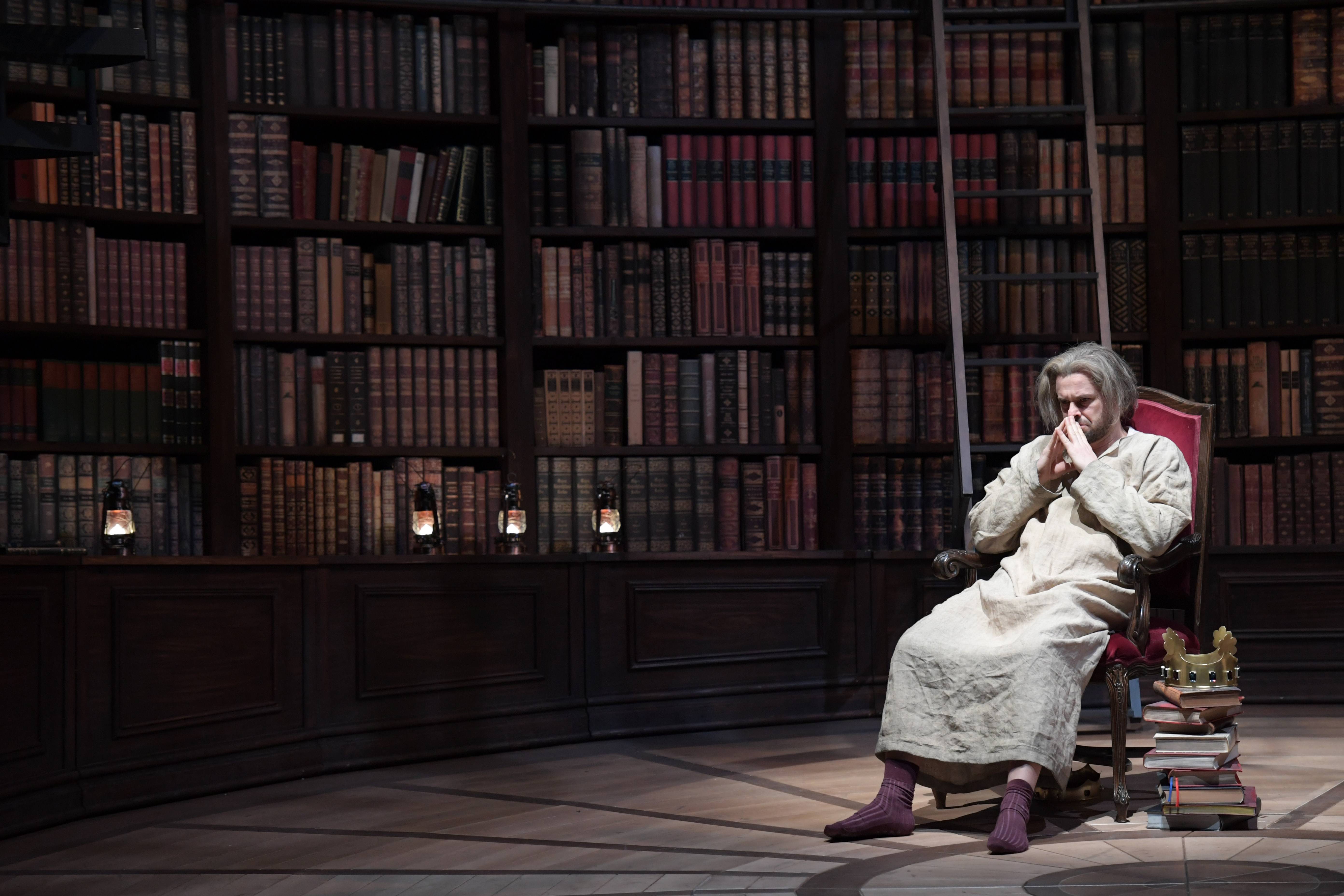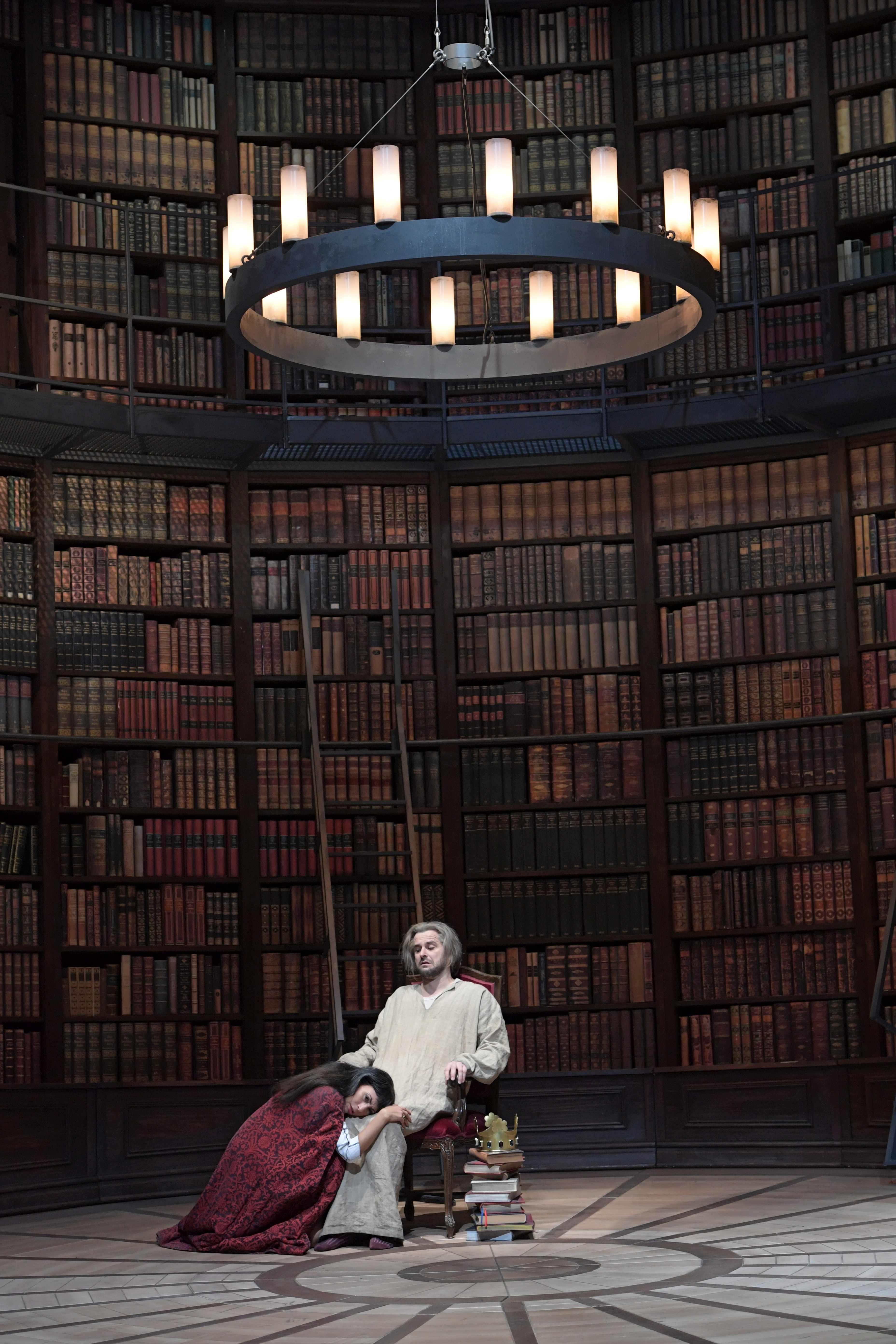 Les costumes de Verena Polkowski présentent un Henri en aube sale qui fait penser à un ermite, idée intéressante même si la principale force de cette proposition provient du décor de Britta Tönne. La scène n'offre qu'une superbe bibliothèque, prison d'un Henri IV qui y pioche régulièrement de la lecture, avant que les livres ne soient retournés par les convives pour exposer un visage sur leurs tranches mises bout à bout. Puis, poussés des étagères à la dernière scène, ils laissent apparaître en arrière-fond les tours actuelles de Francfort. Cette belle idée s'accorde avec une dramaturgie faite d'entrées et sorties par le haut grâce à des échelles ou par le bas à partir d'une trappe dans le plancher. Les prisons ne sont pas toujours celles que l'on croit.