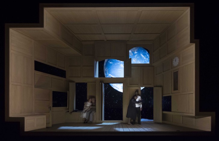 Une pièce de bois blond dans la maison du Bailly, de faible profondeur et aux perspectives raccourcies occupe tout le cadre de scène. Dans sa mise en scène créée à Zurich, Tatjana Gürbaca place l'action de Werther dans ce décor unique, propre à traduire l'univers domestique et quotidien de Charlotte tout comme son enfermement psychologique et sa soumission aux règles sociales. D'entrée, le poète Werther apparaît hors cadre et s'y introduit presque par effraction. Un Werther bien éloigné du classique héros romantique et tourmenté, qu'incarnait à la perfection Jonas Kaufmann, mais plutôt un être différent, symbolisant l'appel d'un ailleurs, d'une autre vie, d'une liberté débarrassée des pressions et des codes en vigueur. C'est pourquoi le décor s'ouvre aux moments-clés sur ce monde extérieur ou sur l'immensité de l'univers et qu'y surgiront par les placards ou les fenêtres des figurants aux costumes festifs et aux regards souvent réprobateurs. Tel est aussi le sens des ballons que s'échangent les protagonistes.