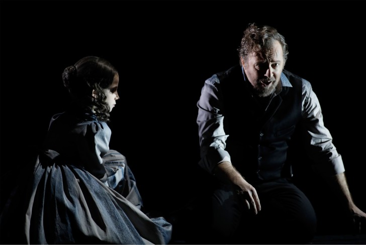 On peut avant tout remercier Andreas Homoki, intendant de l'Opéra de Zurich depuis 2012 et metteur en scène de la création, d'avoir fait le choix de la simplicité et de la cohérence. Les costumes font allusion, directement, à l'époque de Lenau, mais le décor n'est qu'une boîte noire dont le sol est en pente : on ne peut y garder l'équilibre ; et, dans ces costumes, la couleur manque cruellement : il ne s'agit pas ici de l'idylle passéiste dont rêvent tant de spectateurs d'opéra, mais au contraire d'une forme de contrainte – ces vêtements enserrent, dissimulent, nient les corps et les individualité, d'autant que leur auteur, Klaus Bruns, a choisi de leur donner une teinte bleutée uniforme, qui les place d'emblée dans l'irréalité.