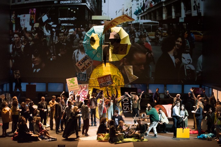 La démonstration clinique débouche contre toute attente sur des torrents d'espoir. Très en phase avec le soulèvement musical du chœur final,  rend un hommage appuyé au mouvement Occupy Wall Street de 2011 en le faisant investir le plateau armé de tentes transformées en baudruche piquée de divers manifestes : I have a dream et autres Basta. Les images extérieures passent du négatif au positif. Les couleurs, jusque là échappées des seuls écrans via les dessins animés avec lesquels la fille du couple infernal se console de la glaciation ambiante, font irruption sur scène. Un des manifestants offre une assiette de soupe à un Macbeth devenu SDF après qu'il a basculé depuis longtemps dans l'inhumanité et la folie meurtrière (on l'aura vu achever Lady M à la fin de Una macchia !). On n'aura garde d'omettre le personnage omniprésent de la technicienne de surface muette (mais pas sourde), qui n'aura plus qu'à danser à la fin comme Elektra : après tout, c'est peut-être elle qui a donné les clés aux manifestants…