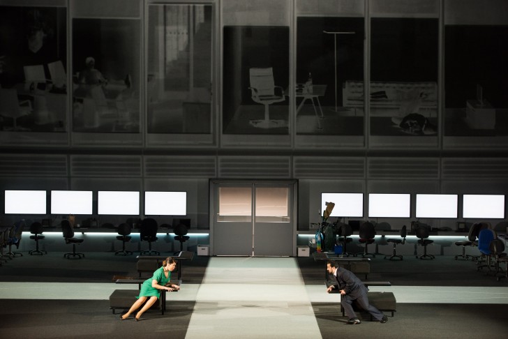 Notre ennemi c'est la finance : c'est l'avertissement clairement lancé par l'ouverture muette du rideau sur le vide d'un espace où la couleur taupe a été érigée en art de vivre. Une ceinture de fauteuils roulants et d'écrans est surmontée d'immenses parois nues. Celle du fond de scène fait défiler des myriades de données numériques, sert de caméra de vidéo-surveillance pour les meurtres en off de Duncan et Banco, mais aussi de baie vitrée sur des vues désincarnées sur New York à la façon des négatifs photographiques de jadis. Depuis Wall Street donc. Après une mise en place au cordeau de l'Introduction, le spectacle n'a plus qu'à dérouler le fil tendu d'un scénario de polar. L'épineuse présence des sorcières devenues tradeuses trouve sa résolution dans les données informatisées qu'elles récoltent. La présence d'une adolescente dans cette famille sans amour paraphe le constat d'un monde désespérant. La transposition est tout sauf hasardeuse, le premier chef-d'œuvre du Verdi de jeunesse (toujours très inspiré avec Shakespeare, qu'il adapte ici lui-même) se prêtant très bien aux cancers du quotidien des hommes. Olivier Py en avait fait, à Bâle, une radiographie des rouages d'une dictature. Van Hove vient rappeler à nos démocraties qu'aucun acquis ne l'est, le pouvoir de la finance ayant par exemple pris le pas sur le pouvoir politique.