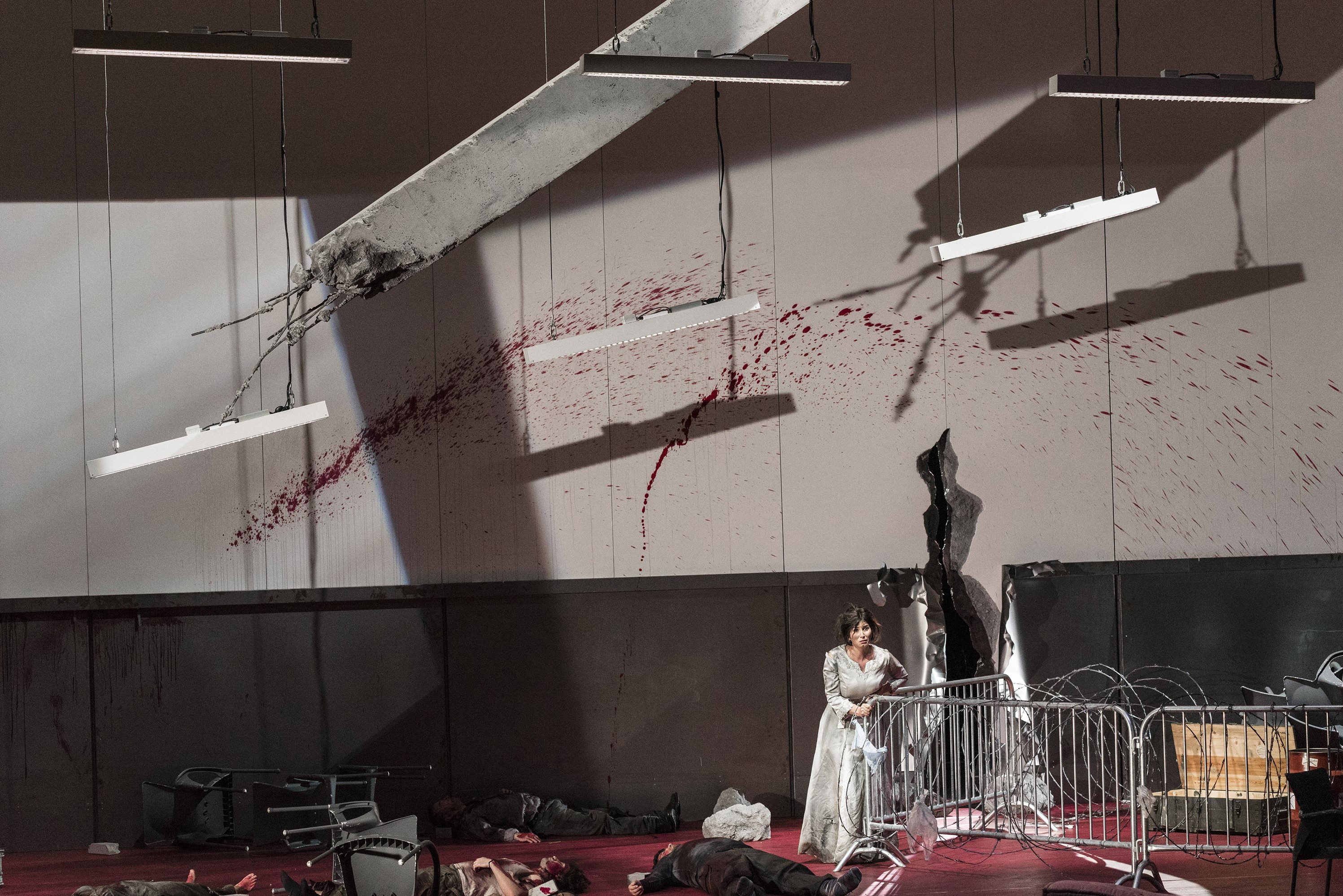 Déception assez cuisante pour le tandem de metteurs en scène, éblouissant de talent à ses débuts (un Songe d'une nuit d'été et des Troyens lyonnais de légende) et même encore aujourd'hui (Norma), qui se repose ici sur quelques éclairs de métier (un prometteur décor parallélépipédique qu'on peut éclabousser de sang et d'éclairages tranchants, qu'une escouade peut fracasser après un assaut à l'hélicoptère) mais qui achoppe assez vite sur la dramaturgie retorse d'un opéra (et c'est la seule circonstance atténuante qu'on leur attribuera) extrêmement difficile à monter. Les anciens y ont longtemps ennuyé et les plus récents s'y sont cassé les dents en voulant légitimement en briser le carcan. Tcherniakov accoucha ainsi avec son Trouvère pour Bruxelles de son spectacle le plus pénible, ce qui lui permit probablement de se venger plus tard avec sa mémorable Carmen pour Aix. Leiser et Caurier ne visent pas si loin. Leur Trouvère fait des tziganes du livret des parias bien contemporains qu'on parque et qu'on égorge. Azucena est leur héroïne comme elle était celle de Verdi qui voulait titrer son opéra La Gitane, et l'on se désintéresse avec eux des imbroglios amoureux des autres protagonistes, avec une direction d'acteurs à la serpe dans un décor perdant peu à peu son pouvoir de séduction initial : ce qui se voudrait espace mental, où les états d'âmes sont lisibles sur les figures imposées à des dizaines de chaises, rappelle le funeste gymnase à tout faire où Sidi Larbi Cherkaoui enfermait récemment ses Indes galantes.