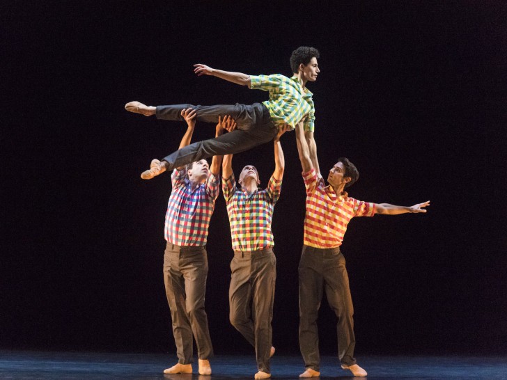 Sarabande est un quatuor masculin allègre et spirituel sur la musique de Bach. Créé en 2009 par la compagnie Danses Concertantes, il est entré au répertoire du Ballet de l'Opéra de Lyon en décembre 2011 et est, depuis, régulièrement reprogrammé, comme ce fut le cas en 2014 à l'Opéra de Lyon. En pantalon de ville et chemise à carreaux colorés, les quatre interprètes sont frais, délicieux, légers, puissants et virtuoses. Ils épousent dans leur diversité les entrelacs de la chorégraphie gracieuse et enlevée de Benjamin Millepied. Ce cocktail que l'on n'avait pas vu depuis bien longtemps sur une scène parisienne est renforcé par l'intimité et l'exiguïté de la scène principale de l'espace Cardin. On est littéralement hypnotisé par l'excellence de ces danseurs, si proches de nous, et l'on craint parfois qu'un saut ou un déplacement ne les envoie dans les projecteurs, à peine cachés derrière les pendrillons noirs.