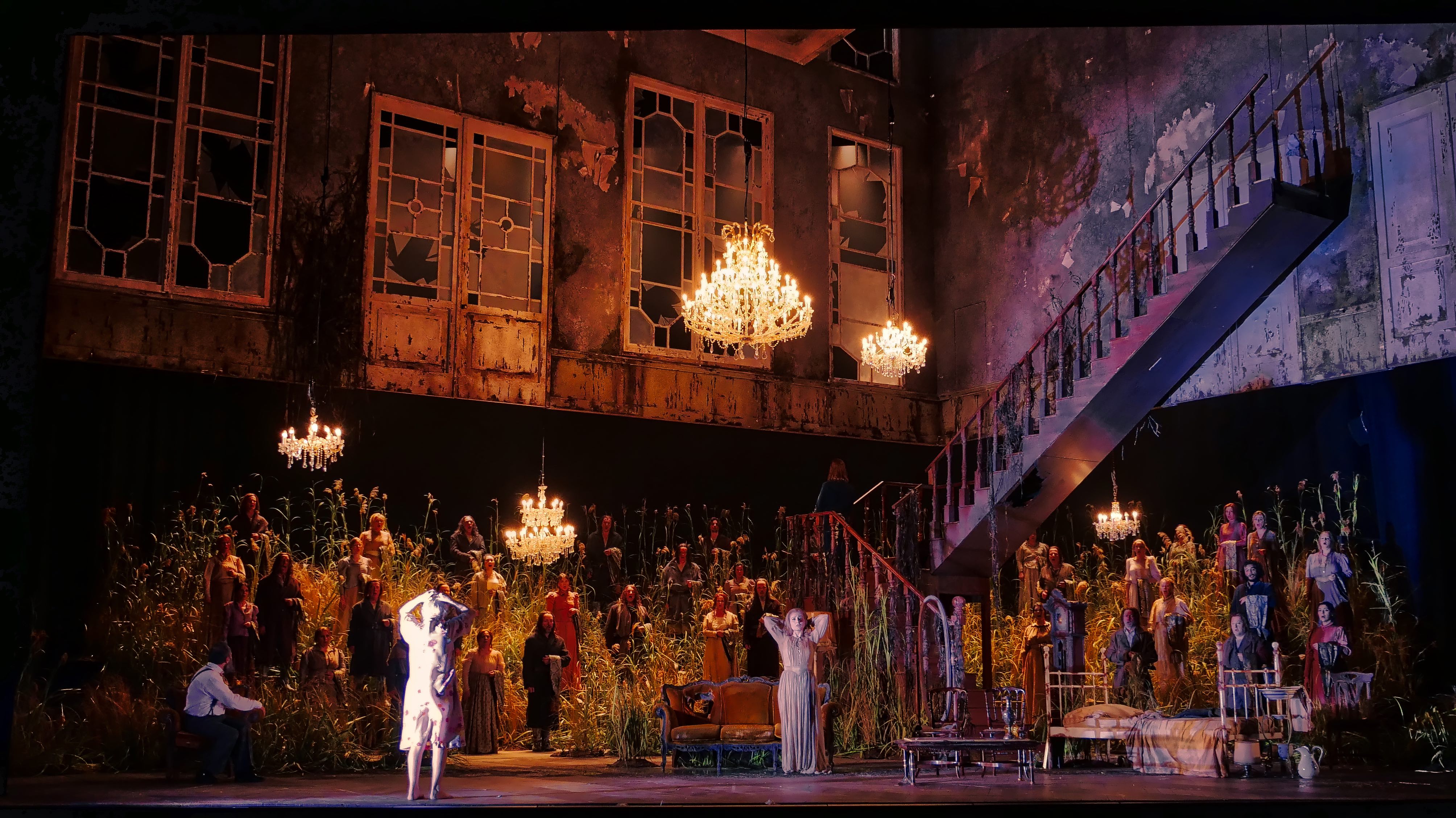 Il y aura donc bien joyeux final entre Elena et son amant Malcolm, après que le roi Giacomo V aura décidé d'abandonner à son second rival (il vient de tuer l'autre, Rodrigo) sa bien-aimée. Mais ce final rappelle que les contes de fées lorsqu'ils sont racontés jusqu'au bout finissent dans un vieux salon, sur deux vieux fauteuils : l'image de l'amour lorsque l'on quitte le romantisme. On trouve de très beaux moments, justement celui où la vieille Elena actrice tombe à l'eau et s'évanouit un instant dans les eaux du lac alors que le roi annonce que la jeune pourra vivre pleinement son amour avec Malcolm. Le somptueux décor sur scène reste cependant le meilleur élément pour porter le drame ; il représente un manoir quasi abandonné à la nature, où les roseaux du dehors prennent de plus en plus le pas sur la résidence.