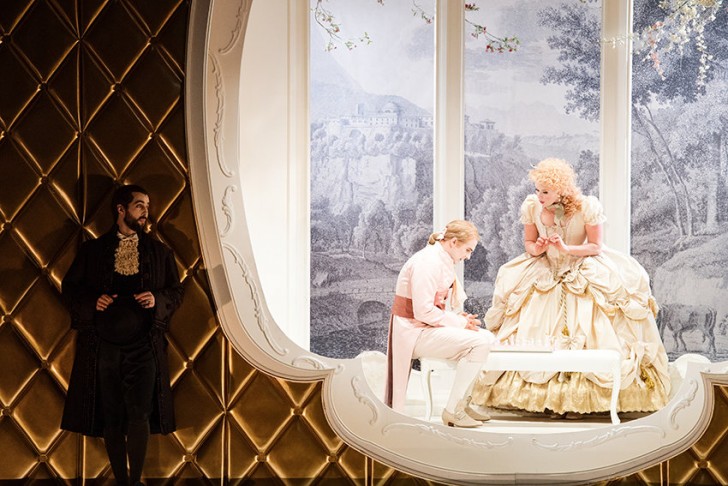 Metteuse en scène américaine ayant très vite travaillé en Allemagne, la jeune Lydia Steier aime à jouer. Sollicitant en virtuose les lumières comme rarement, le blanc aveuglant comme les clignotements de comédie musicale, elle traque le sens de cette « Carrière d'un débauché » déclinée de 1732 à 1733 en huit tableaux par William Hogarth, sur lesquels Auden et Kallmann ont basé leur livret, en les inscrivant dans ce cadre savoureux qui rappelle l'imagerie kitsch des bonbonnières et autres services de porcelaine encore prisés aujourd'hui dans certains foyers. Dans ce spectacle effectivement très « cadré », costumé jusqu'au dernier choriste avec la folie nécessaire (un grand bravo à l'imagination d'Ursula Kudrna), et prompt au second degré, on appelle toujours un chat un chat (choquante et désopilante scène d'un bordel bien sadien). On diffracte les perspectives (l'appartement de Tom), tout en faisant exploser, dès que faire se peut, le corset du Siècle des Lumières, ainsi qu'en témoignent les fréquents « tomber de chemise » du fringant Tom ou la mise au rancart occasionnelle des costumes XVIIIe (Shadow passe des hauts-de-chausses de Don Giovanni au costume-cravate rouge d'un vendeur de voitures), mais aussi l'irruption de quelques accessoires bien connus de nos contemporains (hilarante folie de selfies pour le mariage de Tom avec Baba). À la fin, les contours du cadre ne délimitent plus qu'un théâtre vide et blafard, éclairé aux néons comme dans Alcina, dans lequel les pensionnaires de l'asile s'appuient en toute logique sur des débris de décor. Tout juste détonnent, dans cet univers millimétré où le perpétuel enchantement visuel s'est doublé d'un précipité d'intelligence, quelques instants un peu appuyés : le sur-emploi un peu potache du « phallus à bascule » d'Orange mécanique, ou encore la trop longue éviscération de Nick Shadow (une autre griffe Lydia Steier ? rappelons combien la même pratique plombait déjà son Alcina).