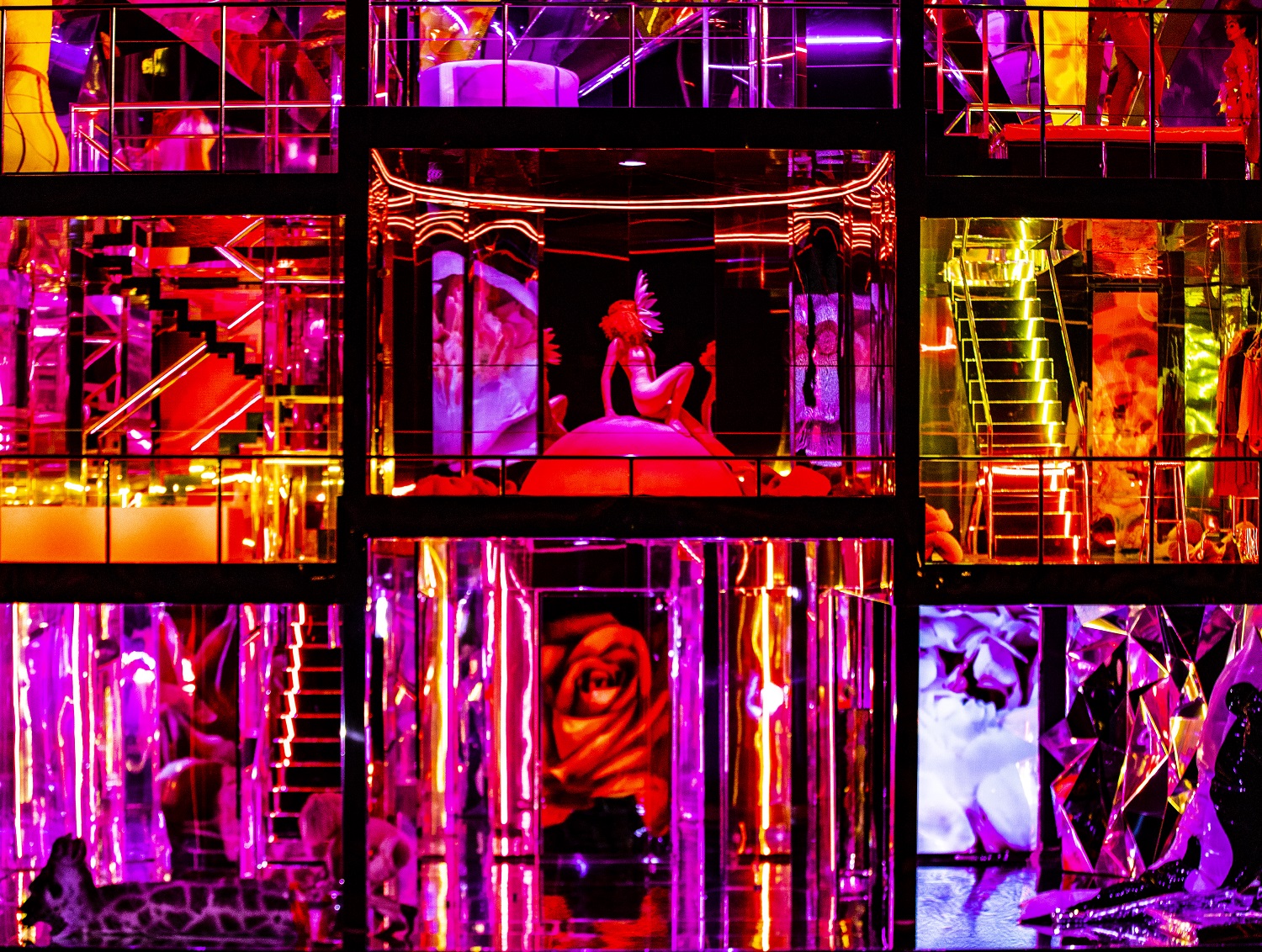 Dans une débauche de couleurs, de vulgarité assumée et de simulations à peine voilées et assez grotesques d'actes sexuels en tout genre, avouons une réelle déception, devant cette gestuelle parfois élémentaire et peu chorégraphique. Faut-il exacerber à ce point le côté glauque d'un livret déjà très connoté, malgré son symbolisme évident ? La seule trouvaille de cette mise en scène (trop) décapante et provocatrice qui nous interpelle est, juste à la fin du spectacle, l'irruption d'un mystérieux personnage en chaise roulante devant la maison close, renvoyant ainsi à la posture d'un Barbe-Bleue arc-bouté et paralytique tel que présenté durant l'opéra. La boucle est ainsi bouclée, et le spectacle du Monde entre incommunicabilité et luxure peut continuer sans fin !