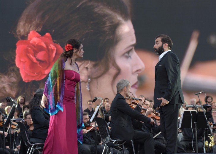 Sur un tréteau, on a donc monté une grande bulle métallique recouverte d'un film plastique transparent. Une structure propre à protéger orchestre, chœurs et solistes d'une averse possible. Pour le public, à lui de prévoir ses habits en conséquence et aux organisateurs d'espérer qu'il sera aussi stoïque que celui de Berlin qu'on a vu recevant des seilles d'eau lors des concerts à la Waldbühne. Mais ces jours de canicule annoncée ont préservé agréablement la nouvelle mouture, qui propose un programme majoritairement composé de « tubes » lyriques chantés par un quatuor d'excellents interprètes.