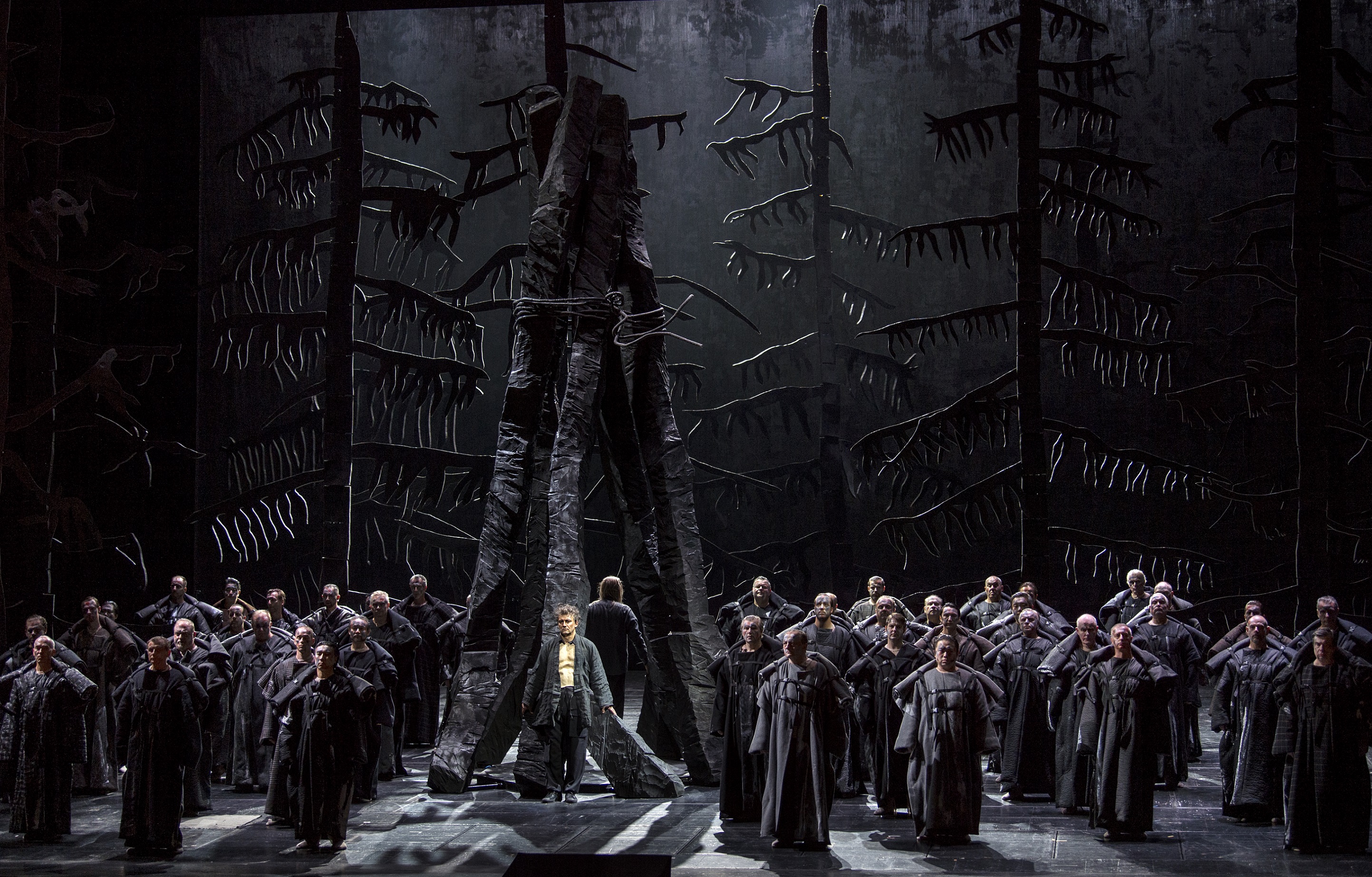 C'était après tout attendu : l'essentiel ici devait être le travail de Baselitz, conçu par lui-même comme une rétrospective d'un demi-siècle de création. C'est peu dire que la déception est à la hauteur de cette ambition : on retrouve certes sa manière dans les corps tête en bas des rideaux de scène, mais une fois qu'ils s'ouvrent, le spectateur est confronté au néant. La forêt d'arbres stylisés en volume du premier acte tue l'espace théâtral, et si l'espèce de totem qui abrite le dévoilement du Graal n'est pas une mauvaise idée, la manière dont la forêt s'effondre à la fin de l'acte est ridicule. Au second acte, une simple paroi peinte façon château fort monte au début de l'acte et descend à la fin ; quand s'ouvre le rideau sur le troisième acte, c'est la forêt du premier qui réapparaît la tête en bas : c'est d'autant plus consternant que ces deux actes sont plongés dans une même pénombre qui est un des clichés les plus éculés de la mise en scène wagnérienne. Quel dommage que l'Opéra de Munich ait pour si peu mis au rebut un des trésors de son répertoire, la mise en scène de Peter Konwitschny, créée certes en 1994, au siècle dernier, mais si forte et si intelligente !
