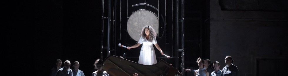Aix en Provence. Théâtre du Jeu de Paume. 12-VII-2018. Ondřej Adámek (né en 1979) : Seven stones, opéra a capella pour quatre chanteurs solistes et douze chanteurs choristes sur un livret de Sjón. Mise en scène et chorégraphie : Eric Oberdorff. Scénographie et lumières : Eric Soyer. Costumes : Clémence Pernoud. Avec : Anne-Emmanuelle Davy, Maid, Storyteller I; Shigeko Hata, Land Lady, Storyteller II ; Nicolas Simeha, Stone Collector ; Landy Andriamboavonjy, Stone Collector’s wife. Chœur Accentus/axe 21, direction musicale : Léo Warynski