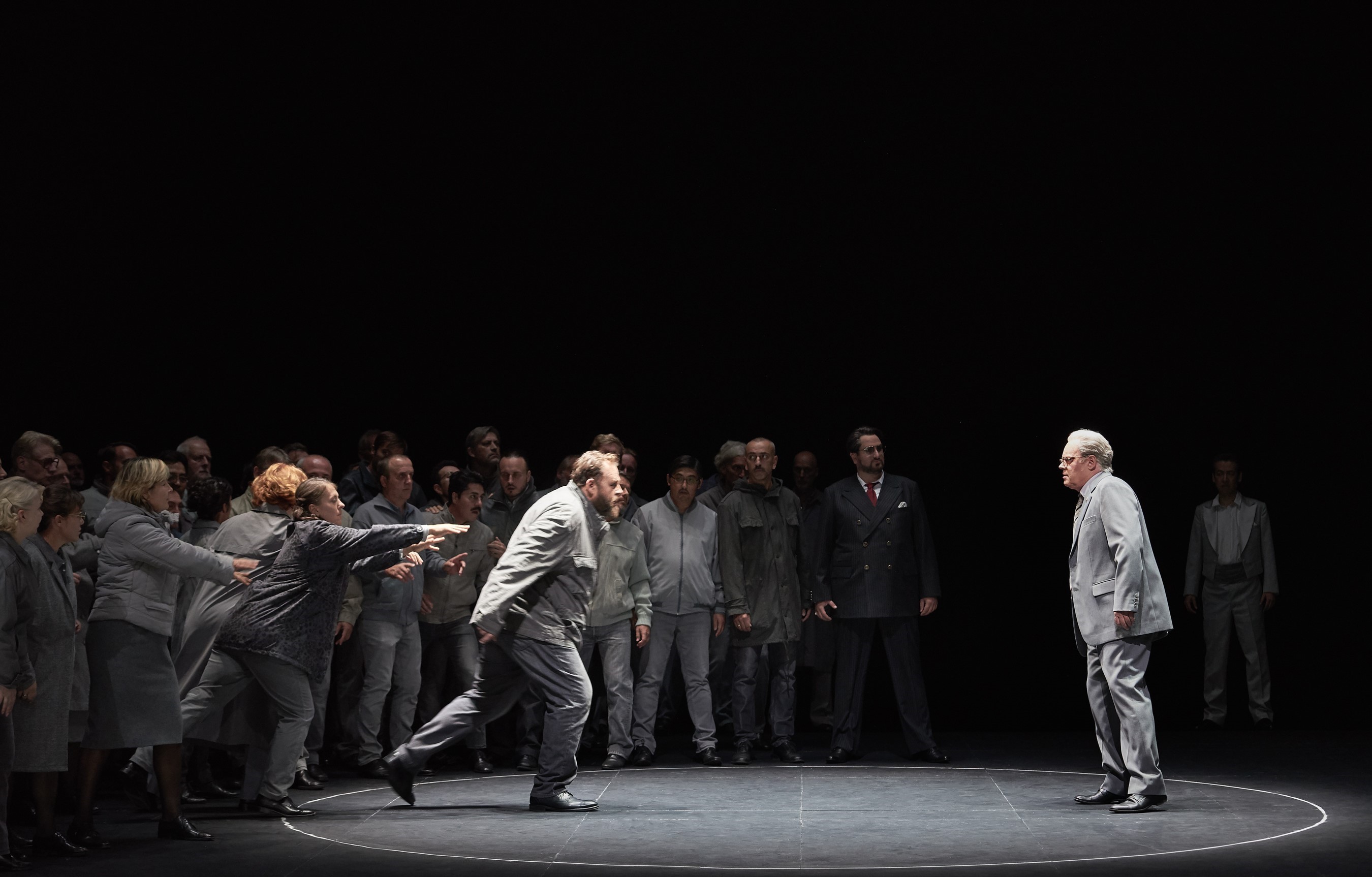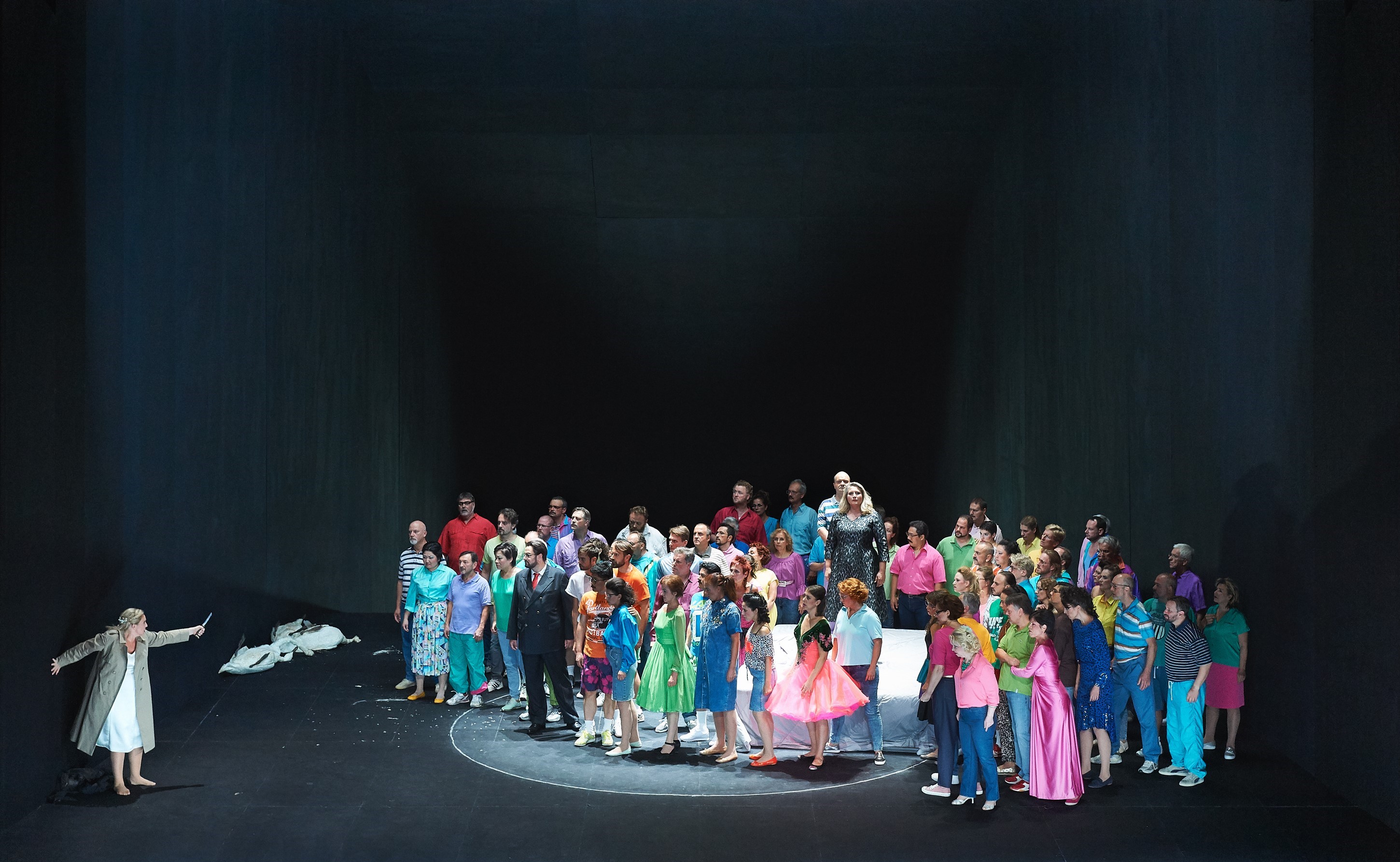 Lohengrin, c'est l'histoire d'un sauveur – malheur à qui croit aux sauveurs. Homme providentiel peut-être, mais aussi expression d'une aspiration à la libération : quand Lohengrin doit combattre Telramund, c'est parce que le peuple l'y pousse, pour ne pas dire l'y force. Le premier acte, réduit à des moyens théâtraux minimaux, est d'une force remarquable : sans autre accessoire qu'un petit cygne en peluche, sans autres costumes qu'une grisaille universelle qui dit le désarroi d'une société sans élan collectif, Schilling rend simplement visibles les enjeux dramatiques et politiques de l'arrivée de Lohengrin. Le décor, dans son épure radicale, est un des plus beaux, un des plus forts qu'on ait vus récemment, avec cette profondeur, ces noirs, ces lumières d'une délicatesse rare. Un cercle tracé à la craie pour le combat entre Lohengrin et Telramund prend une force surnaturelle, et même si Telramund tente de l'effacer d'un geste rageur au début du deuxième acte, cette manière de matérialiser la force de l'incarnation parcourt tout le spectacle. La couleur paraîtra seulement à l'acte II, quand la société reprend espoir par le mariage entre Lohengrin et Elsa – mais le spectacle s'intéresse autant à ce phénomène de l'incarnation qu'à son échec final, et au-delà de ses immenses qualités plastiques, le spectacle tire sa force de l'évidence avec laquelle Schilling rend concrets et évidents les apories de cette société incapable de créer un avenir sans son sauveur.