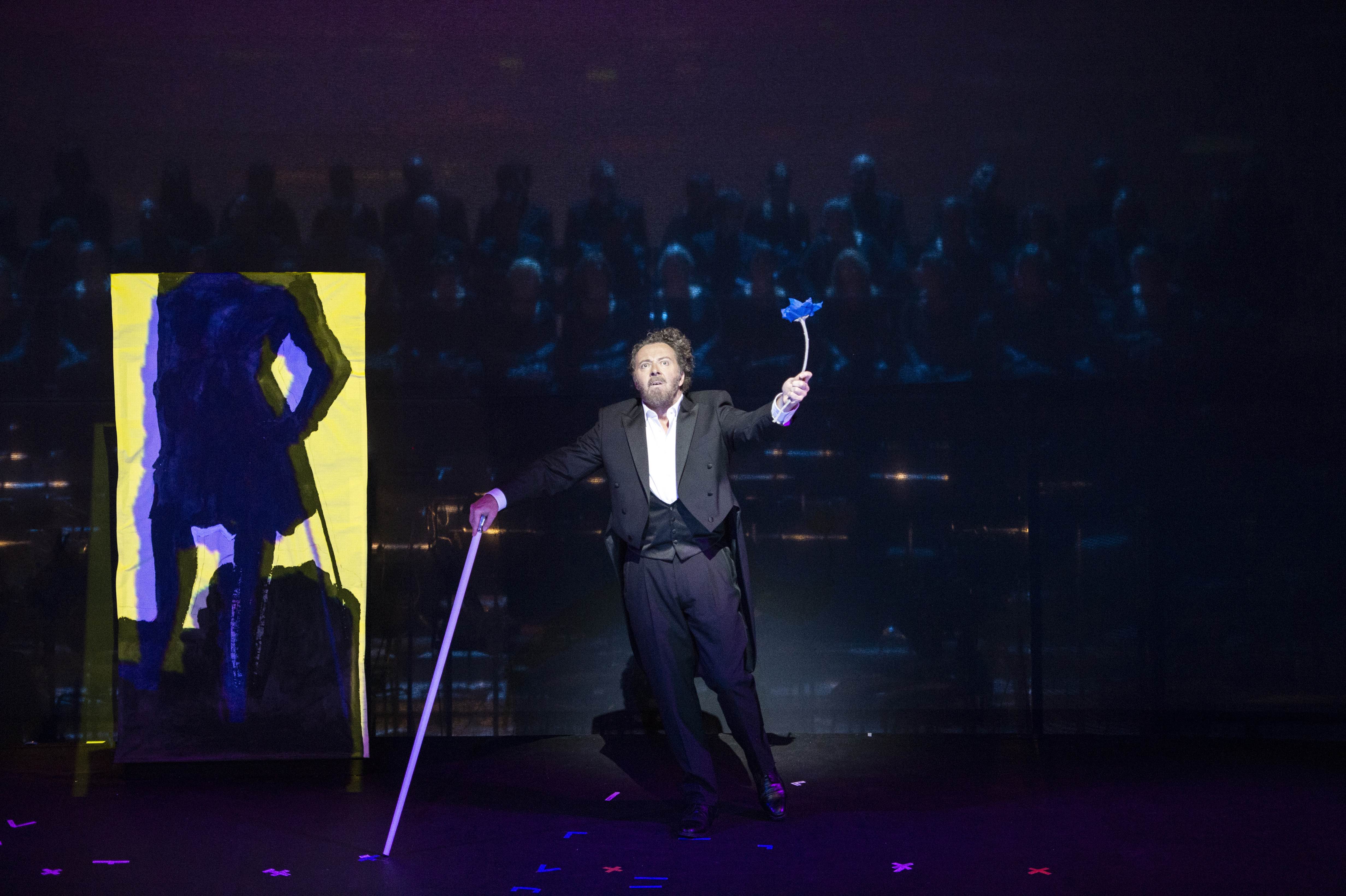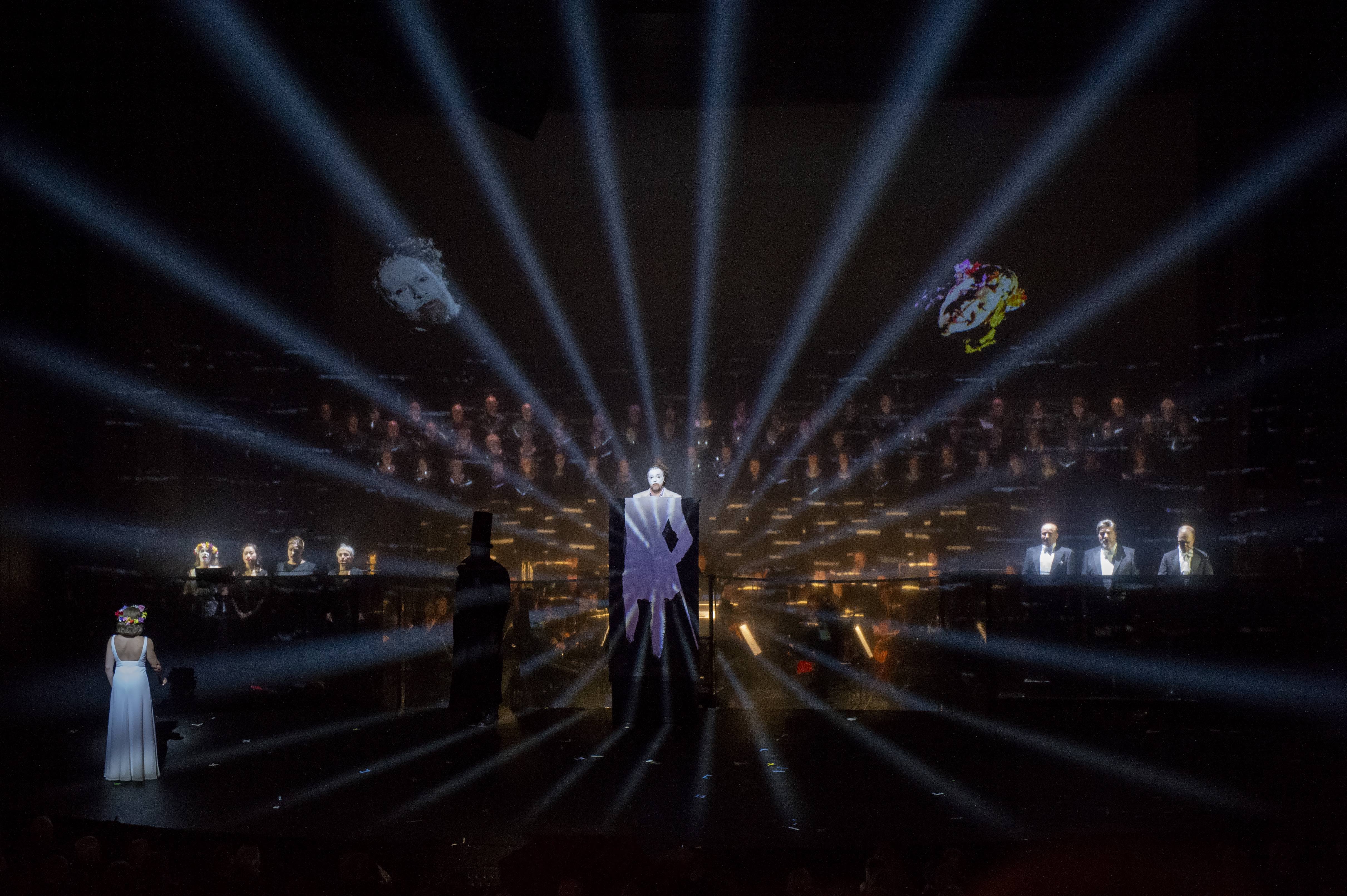 Achim Freyer, dont on vient d'apprendre qu'il mettait en scène Œdipe l'été prochain à Salzbourg, doit comme Jürgen Flimm pour le Staatsoper Berlin ces dernières années s'atteler à occuper l'espace pendant que l'oratorio de Schumann se développe. La modeste dramaturgie du livret ne permet pas d'interactions fortes entre les personnages, alors Freyer occupe l'espace avec des assembleurs en noir, qui posent au fur et à mesure des éléments référents à l'humanité. Successivement apparaissent une robe de mariée sur un mannequin, une brouette, un métronome, un arc en ciel, une trompette, tous ces objets sur lesquels sont ensuite apposés des voiles noirs pour annoncer la mort. Au centre, le tableau du Voyageur contemplant une mer de nuages de Caspar David Friedrich, visible à la Kunsthalle de Hambourg, est coupé en haut du buste pour laisser s'insérer le haut du corps de Gerhaher. Son image, d'un homme d'abord magicien avec un bandeau sur les yeux, devient par la suite celle d'un véritable aveugle ayant besoin d'une canne, pour finir clown blanc en dernière partie. Le tableau se colore par lumières projetées, d'abord en fluo rose et jaune, évidente référence au tableau de Goethe retouché par Andy Warhol. Puis la brume devient arc-en-ciel avant de n'être plus qu'un noir faisant ressortir le corps blanc accompagné d'une lumière blanche pour montrer le centre, et donc Gerhaher, comme l'entrée au Paradis.