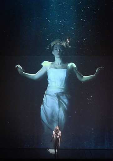 Le travail de Cyril Teste est un travail sur l'image. D'abord par l'utilisation de la vidéo. Le procédé n'est plus nouveau dans l'univers du lyrique mais on y trouve ici du sens. Au plus près des personnages, la caméra scrute leur désarroi, leur solitude, leur frayeur en les isolant de la masse jusqu'au dernier gros plan sur le visage d'Hamlet/Degout, vainqueur mais terrifié et interrogatif. Ensuite parce que Cyril Teste sait installer des atmosphères et des images fortes telles l'arrivée du nouveau roi Claudius par la salle, sous les flashs de la presse people installée sur scène, retransmise en direct sur l'écran, ou bien encore la noyade d'Ophélie suggérée par la succession de rideaux d'images d'eau enveloppantes. On reste marqué par la spatialisation du chœur et des protagonistes et notamment par l'apparition du spectre parmi les spectateurs, seuls comme lui, à connaître les ressorts du drame. On est fasciné par cet Hamlet errant, qui semble si jeune et impuissant parmi la foule des courtisans, par ses scènes d'égarement dans un décor mouvant et toujours fluide ou au milieu d'un chœur superbement dirigé. Car tout cela fonctionne d'autant mieux que la direction d'acteurs au scalpel est particulièrement bien relayée par un casting particulièrement investi.