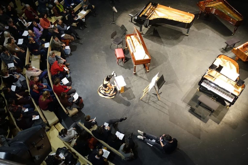 pianos-pianos-photo-in-situ-1024x683C'est une initiative de la et de la Médiathèque Musicale Mahler (MMM) qui donne en cette fin d'année 2018 le coup d'envoi du festival Pianos, pianos. L'idée est d'observer l'évolution du piano de ses origines (fin XVIIIᵉ siècle) à nos jours, à travers les différents instruments d'époque et le répertoire des collections de pianistes conservés à la MMM. Six pianos sont sur le plateau des Bouffes du Nord pour une première journée pleine de de surprises et de pépites.