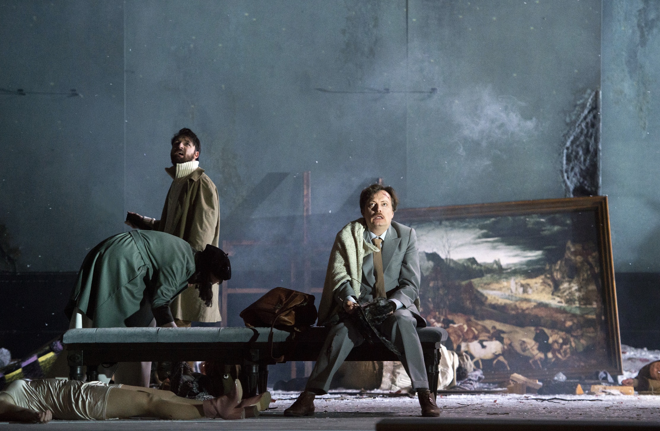 Cette fois, donc, il y a des personnages : deux couples, un homme seul qui semble devoir donner le sens de l'histoire, et une femme seule, récitante. C'est elle – la star de cinéma Martina Gedeck – qui ouvre l'œuvre, en décrivant le tableau de Bruegel Chasseurs dans la neige, cité dans Solaris : les personnages de l'opéra sont prisonniers d'une tempête de neige, comme il y a vingt ans ceux de 60e Parallèle de Philippe Manoury. Ces derniers étaient pris dans la trivialité de leurs déboires sentimentaux, ceux de Furrer ne parviennent au contraire pas à exister, et qui ne connaît pas d'avance les voix d'Elsa Dreisig et d'Anna Prohaska n'aura guère de moyen de savoir qui est qui ; les perruques noire de l'une et blonde de l'autre les distinguent beaucoup mieux que ce qu'elles ont à chanter. Les cinq chanteurs font beaucoup d'efforts pour exister et convaincre le spectateur de la nécessité de ce qu'ils chantent, mais l'obscurité du livret ne leur donne guère de chances d'y parvenir. La mise en scène de Claus Guth occupe l'espace à grands renforts de décors qui montent et qui descendent, mais elle ne parvient pas à ôter de la tête des spectateurs l'idée qu'une telle musique aurait sa place au concert plus que sur une scène d'opéra.