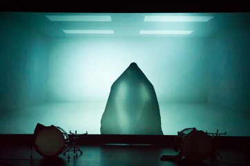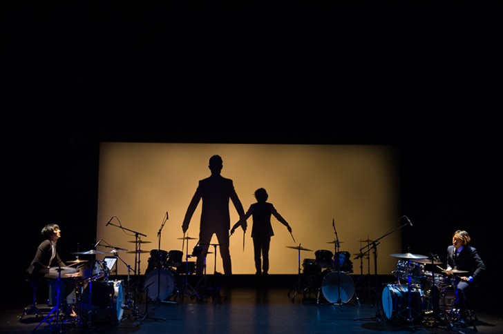 Dans un premier « acte » (le terme est de nous), les quatre interprètes en noir et capuche sont au tambour, spectres émergeant de l'ombre. Les tambours sont tapés, grattés, frottés à la main, à la baguette et avec divers accessoires, dans une partition très structurée et prenante (ainsi l'alternance de coups forte et de grattements diffus). Les dimensions visuelles et auditives sont intégrées et dialoguent abondamment. Sur scène, percussions, électronique en direct, geste des interprètes, jeux de lumière, projection vidéo sont entièrement liés. Aussi faut-il saluer l'interprétation millimétrée et dense de Percussions de Strasbourg et de la console, qui se confirme tout au long du spectacle.