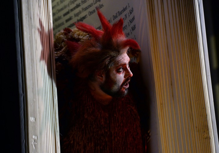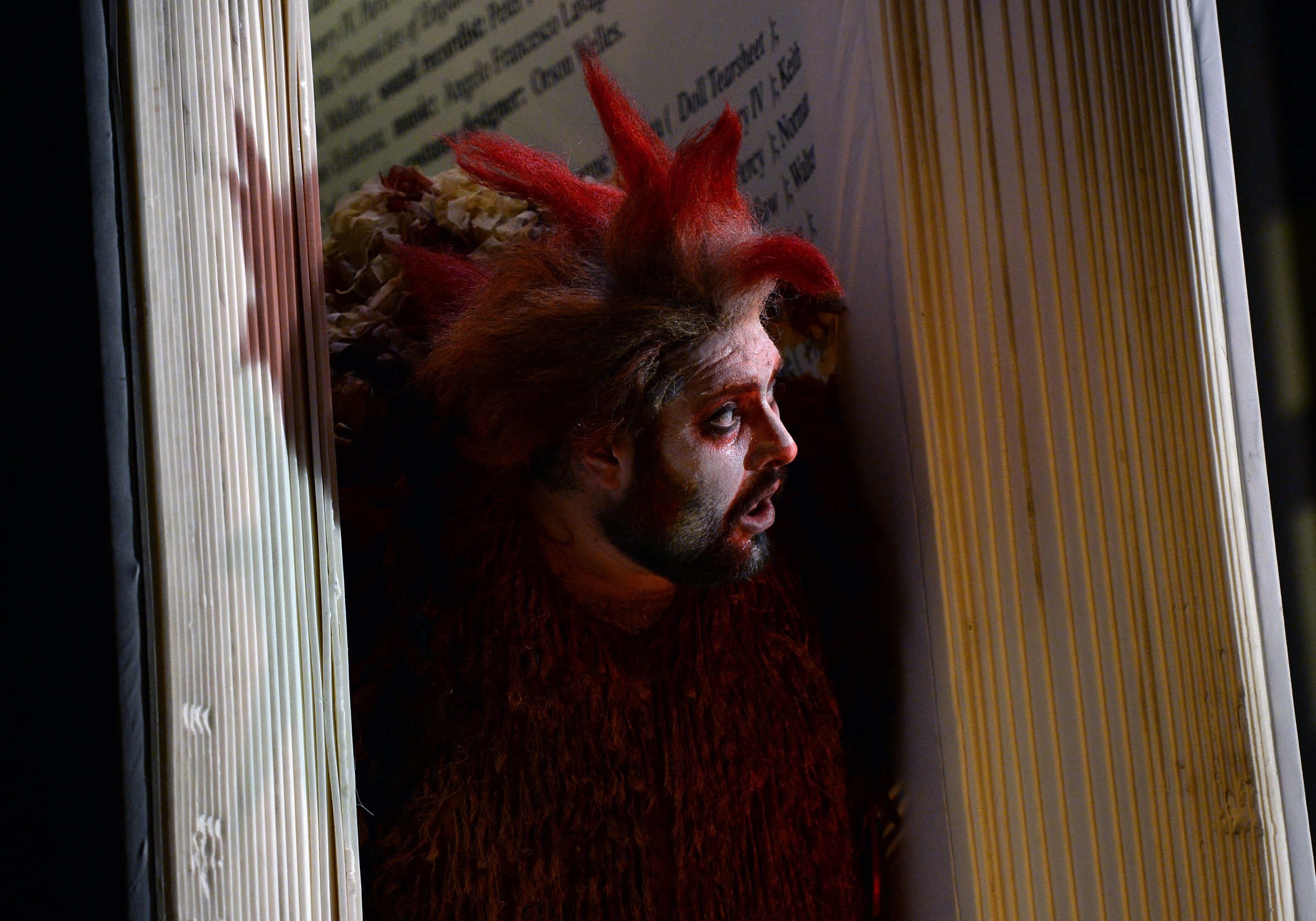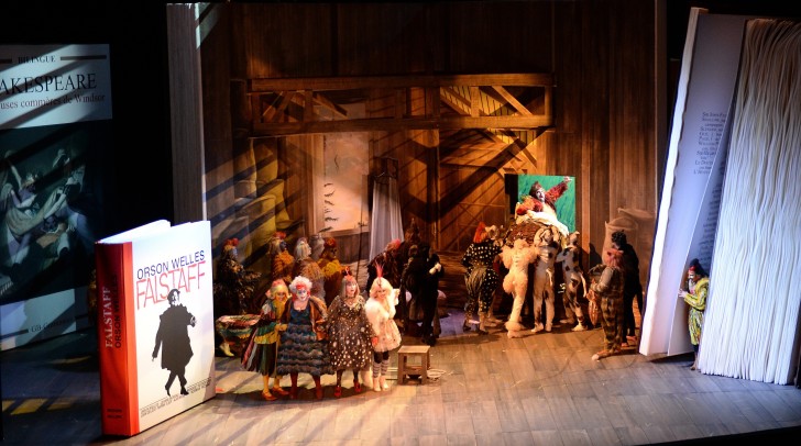 Sir John y parade en coq, sautant sur tout ce qui bouge, la poule (logique !) Meg, et même la pintade (plus improbable !!) Alice. Miss Quickly est une dinde (Sir John s'arrêtera là) prompte à faire la roue. Le docteur Caïus, bien que dindon de la farce, est un âne (forcément). Bardolfo et Pistola un malicieux couple de chats. Nanetta une jeune pintade blanche émancipée par Fenton, pour l'heure jeune coq fringant mais possible Falstaff en devenir. Tout ce petit monde à plumes et à poils (métaphore amusée du petit monde des chanteurs lyriques ?) caquette à loisir, trouvant son grain à moudre dans l'environnement littéraire d'une poignée d'ouvrages ayant trait au Pancione. Le gigantisme de volumes aux titres identifiables (dont l'intégrale Shakespeare de La Pléiade, le livret de Verdi, et même le Falstaff d'Orson Welles), posés sur la tranche, forme le sobre décor de l'Acte I. Pour notre grand bonheur d'ex-enfants, ils s'entrouvrent au II. Les personnages en sortent, s'y réfugient. L'intérieur des Ford s'inscrit sur deux pleines pages dont l'une est découpée en fenêtre afin d'y pouvoir envoyer la fameuse « panière à Falstaff » dans la Tamise. Au III, le plus gros livre se déploie complètement et, à la manière des enchantements pop up, déplie le décor forestier de la machination finale, magnifiquement mis en relief par les lumières de Laurent Castaingt.