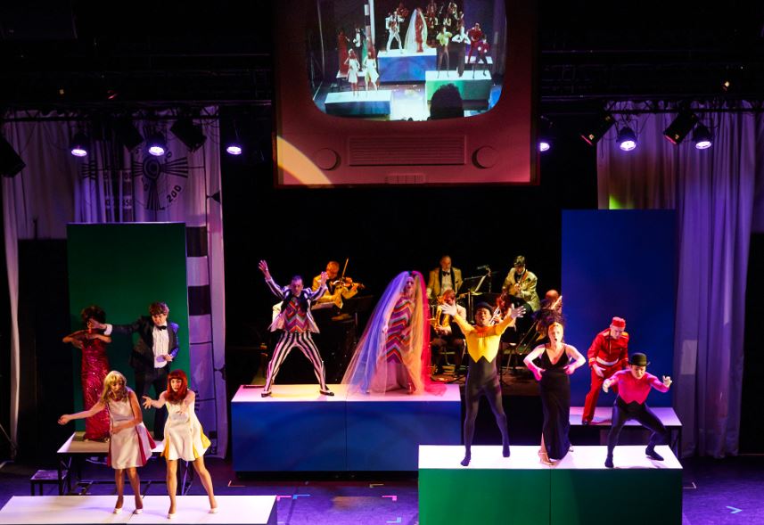 La Vie Parisienne -c- Nelly Blaya24_optL'Opéra national du Rhin avait fait mouche avec sa superbe découverte de Barkouf. La Vie Parisienne, quant à elle, n'a pas besoin d'un tel évènement que celui d'un bicentenaire pour une programmation régulière dans les salles. Et alors que y faisait apparaître Sonia Rykiel, et Geneviève de Fontenay, y met en scène Nana Mouskouri, Sheila, Sylvie Vartan, Mireille Mathieu, Louis de Funès en gendarme de Saint-Tropez ou bien encore « Cloclo d'Alexandrie. » La comparaison s'arrête là. D'une jouissive Vie parisienne telle que celle vue à Bordeaux, on passe à une grossière caricature des émissions de variétés télévisées en mode sixties. Le décor de David Belugou était pourtant prometteur, fort d'un agencement minutieux de nombreux éléments modulables directement par les artistes sur scène, et de deux télévisions vintages faisant apparaître en direct le résultat final du show filmé (toujours un peu agaçant de constater que les artistes s'adressent à la caméra plutôt qu'à la salle même si c'est ici plutôt bien calibré).