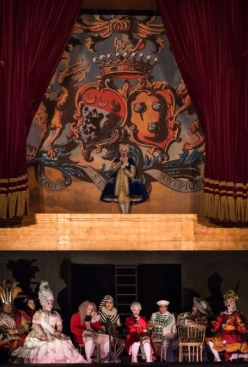 Michel Fau choisit la disposition d'un décor vertical pour le prologue, où la préparation d'un opéra par les quatorze intervenants, qui ne seront plus que sept lors de la représentation à l'acte I, justifie l'alternance dans la seconde partie de l'œuvre de la présence d'éléments venus de l'opera seria, de l'opera buffa et de la commedia dell'arte. Puisque le maître des lieux, commanditaire d'un petit opera seria, Ariane à Naxos, décide d'y associer un opera buffa puis de faire entremêler les deux, au grand dam du compositeur. C'est cette autorité que le metteur en scène préfère mettre en avant, le Majordome, rôle parlé admirablement tenu par un comédien de premier plan en la personne de Florian Carove, étant disposé en hauteur des comédiens afin de projeter la haute domination de son maître. Ce parti-pris est donc en défaveur du brouhaha général qui agrémente la première partie de l'ouvrage, les loges exiguës en sous-sols ne permettant pas d'amener un tourbillon scénique de bon augure. Les perruques surdimensionnées et les robes à paniers démesurés – admirables costumes de David Belugou -, limitent les gestes et les déplacements de celles et ceux qui les portent. La seconde partie du spectacle dévoile une approche plus intéressante avec une esthétique Art Déco de carton-pâte et quelques effets de machineries que l'on pourrait rapprocher de l'opéra baroque. Le regard sur la solitude d'Ariane se révèle plus authentique et réaliste que le prologue, à l'inverse du livret initial de Hofmannsthal.