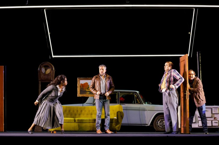 L'année passée, nous n'avions pas totalement goûté aux charmes des décors de Paolo Fantin pour la mise en scène de Don Pasquale proposée par Damiano Michieletto. Pourtant, malgré l'absence de murs, tout y est pour coller au livret de ce dramma buffo et déclencher les rires réguliers. L'ouverture de rideau donne à voir quelques vieux meubles, de l'horloge de salon au poêle de cuisine, avec dehors, juste derrière une porte isolée, une vieille Lancia. Une fois le mariage acté, la sainte Norina devient fléau, et d'un mobilier défraîchi, tout disparaît au profit d'objets designs, souvent choisis pour leur style nouveau-riche, d'une horloge Tiuku à une Maserati Quattroporte.