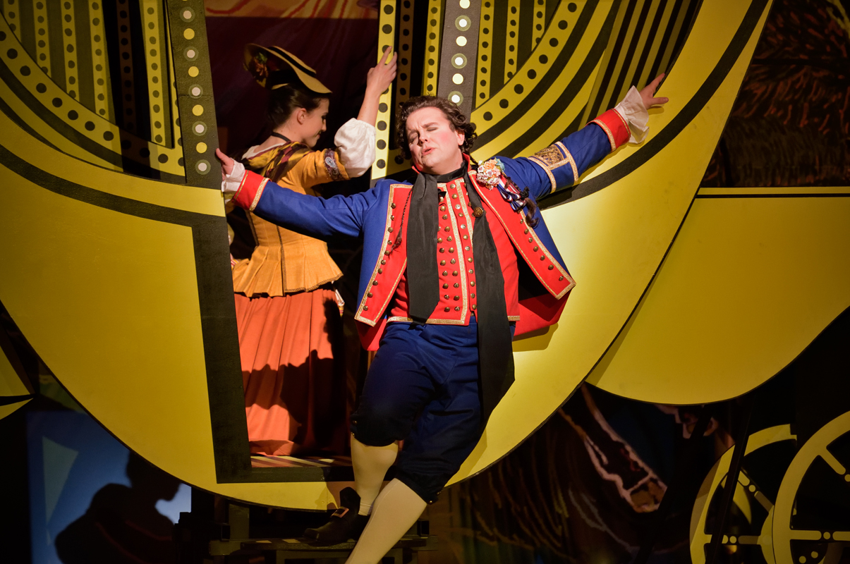 La mise en scène est confiée à Michel Fau, dont on connaît l'immense culture, le sens de la démesure et le goût du travesti (lire notre entretien). Cette fois encore, il ne nous déçoit pas. Tout dans sa conception évoque une certaine idée que nous nous faisons de l'opéra de la fin du XVIIIe siècle, période à laquelle régnait sur scène Pierre Jélyotte, créateur entre autres de Platée, qui servit de modèle au personnage de Chapelou, héros de l'histoire, qui, abandonnant son épouse le soir de ses noces, s'envole vers la célébrité sur les planches de l'Académie Royale de Musique.