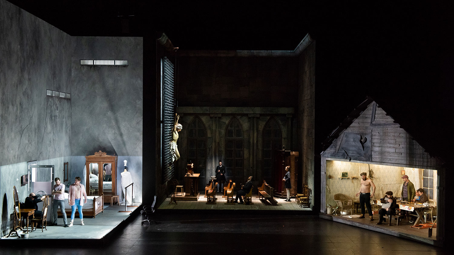 Longueurs, confusion dans l'intrigue, personnages mal définis car bien trop nombreux (17 !) : le livret d'Ippolit Chpajinski détient bien des faiblesses. En toute conscience, Tchaïkovski lui-même assurait que de cette pièce, « seule son essence sera préservée ». Cette essence, Andriy Zholdak la décèle clairement dans un parti-pris qui dérange, entre perversion sordide et distanciation libératrice, entre sexualité perverse et religion manipulatrice. La patte du metteur en scène ukrainien s'affirme dès le début de la représentation où la longue scène introductive en vidéo nous fait passer des rues lyonnaises à la scène de l'Opéra, avec le personnage du clerc Mamyrov, qui après avoir surfé sur un site de rencontres, ne tarde pas à chausser un casque de réalité virtuelle pour suivre les aventures de Nastassia et de ses acolytes. Oubliées les danses remplacées par les mouvements poétiques d'un décor en triptyque majestueusement mobile, dilués les chœurs qui opèrent hors scène (magistralement !) tout au long du spectacle, Andriy Zholdak foisonne d'idées autant pour l'omniprésence d'une morale religieuse plus que douteuse, que pour le fossé patent entre les milieux sociaux des différentes protagonistes.
