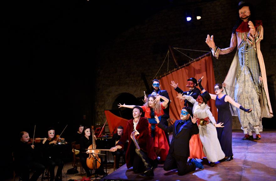 Pour mettre en exergue cette mascarade, la mise en scène de Raphaël de Angelis use de masques de commedia dell'arte. Parfois menaçants (les médecins et leur nez inquiétant), parfois purement clownesques (hilarant apothicaire !), ceux-ci sont les principaux éléments de cette approche. Seul le triangle amoureux en est dépourvu pour que le public s'identifie aux personnages. Cette ambiance quelque peu désuète, entre décor en tréteaux et simple rideau en fond, réconforte et nous fait presque revenir en enfance, comme la qualité de jeu des différents comédiens. Finalement, le risible héros ressort victorieux de cette farce : la gigantesque marionnette qui lui ressemble trait pour trait confirme ce dénouement et émerveille le jeune public, venu nombreux ce soir, tout comme le spectateur averti.
