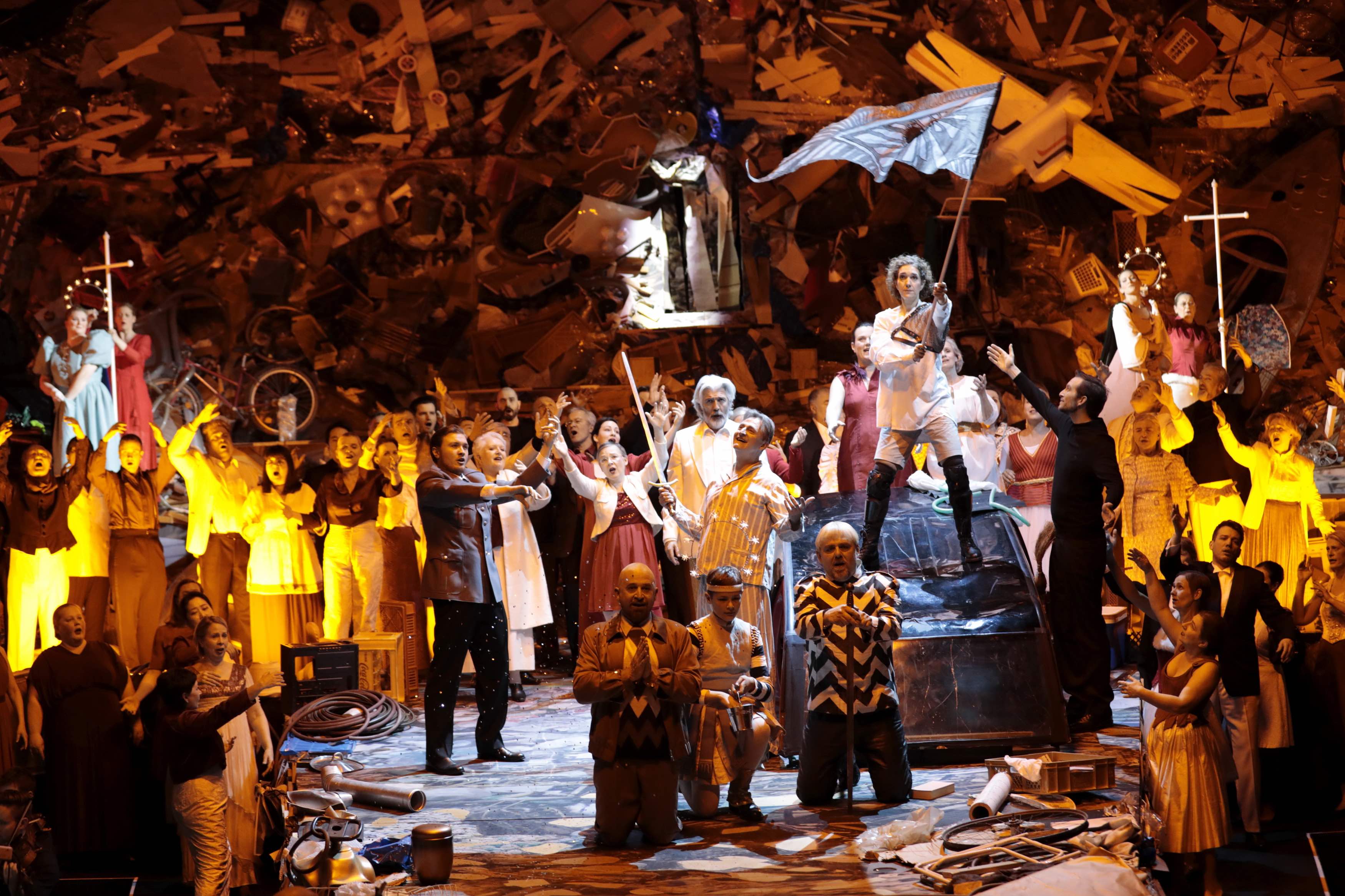 C'est donc Cologne encore, ville dans laquelle est mort le compositeur en 1954, qui défend son œuvre. L'Opéra principal n'en finissant pas d'être reconstruit, les représentations sont toujours déplacées à la temporaire Staatenhaus. Le public y est installé sur des gradins devant une scène très limitée pour les changements de décors, ici de Stefan Heyne. L'orchestre est placé cette fois à gauche, les percussions, piano et célesta à droite.