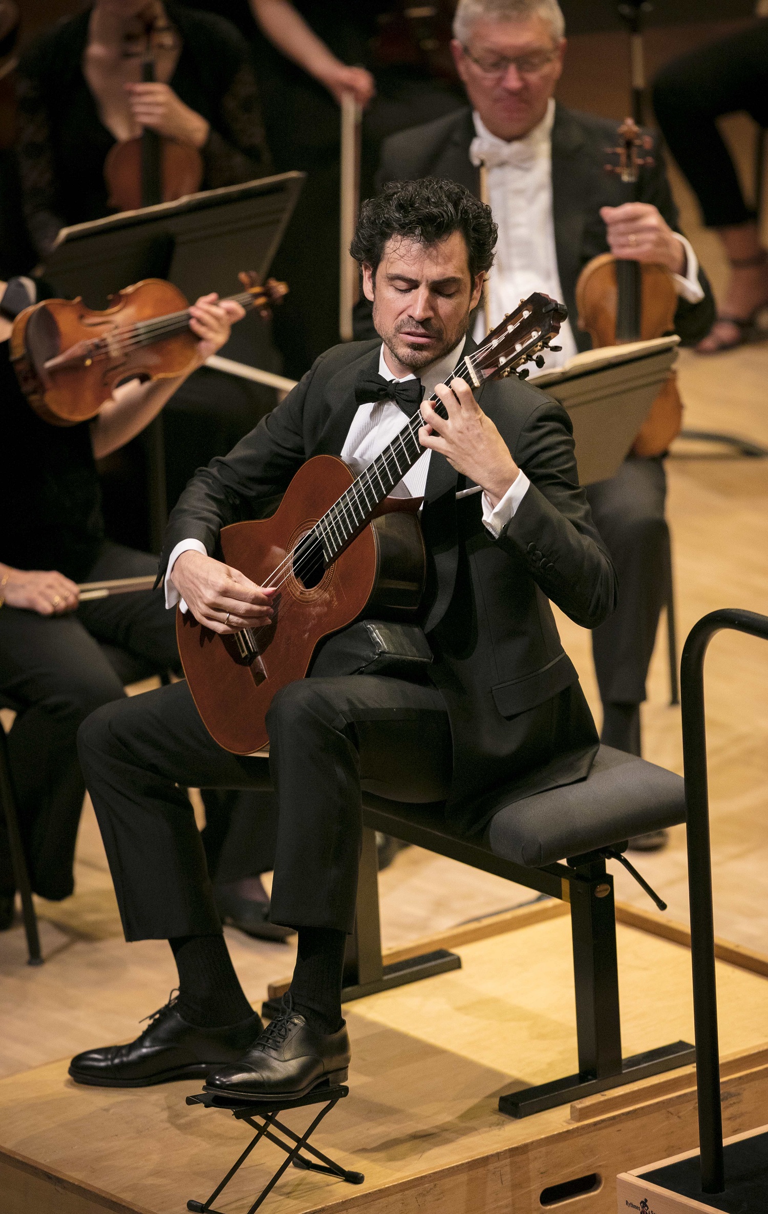 L'arrivée du guitariste Pablo Sáinz Villegas, fringant quadragénaire, fait impression. Sa réputation d'être l'un des plus grands guitaristes le précède et l'on attend que le feu sorte de son interprétation. Mais, dès les premières mesures, quand bien même les doigts courent sur le manche avec vélocité et précision, le son de l'instrument apparaît terne, comme aplati. L'impression que l'instrument ne sonne pas. Pourtant, tout est là. Les notes se suivent, l'orchestre s'emploie subtilement à ne pas étouffer le soliste. Mieux, il varie son volume sonore superbement pour mettre en valeur les interventions de la guitare. Bien sûr, c'est l'œuvre de Rodrigo qu'on entend mais, dans une interprétation sans beaucoup d'âme, presque impersonnelle. Dans le sublime adagio, comme un fait exprès, on s'endort entre les pupitres à force d'exagérer le pathos. Dans l'allegro gentile ultime, le charismatique chef d'orchestre Jaime Martín reprend les rênes de son orchestre et emmène Pablo Sáinz Villegas dans un vibrant final. Le public, satisfait d'avoir entendu cette œuvre populaire s'enthousiasme, applaudissant sans grande retenue tout ce beau monde.