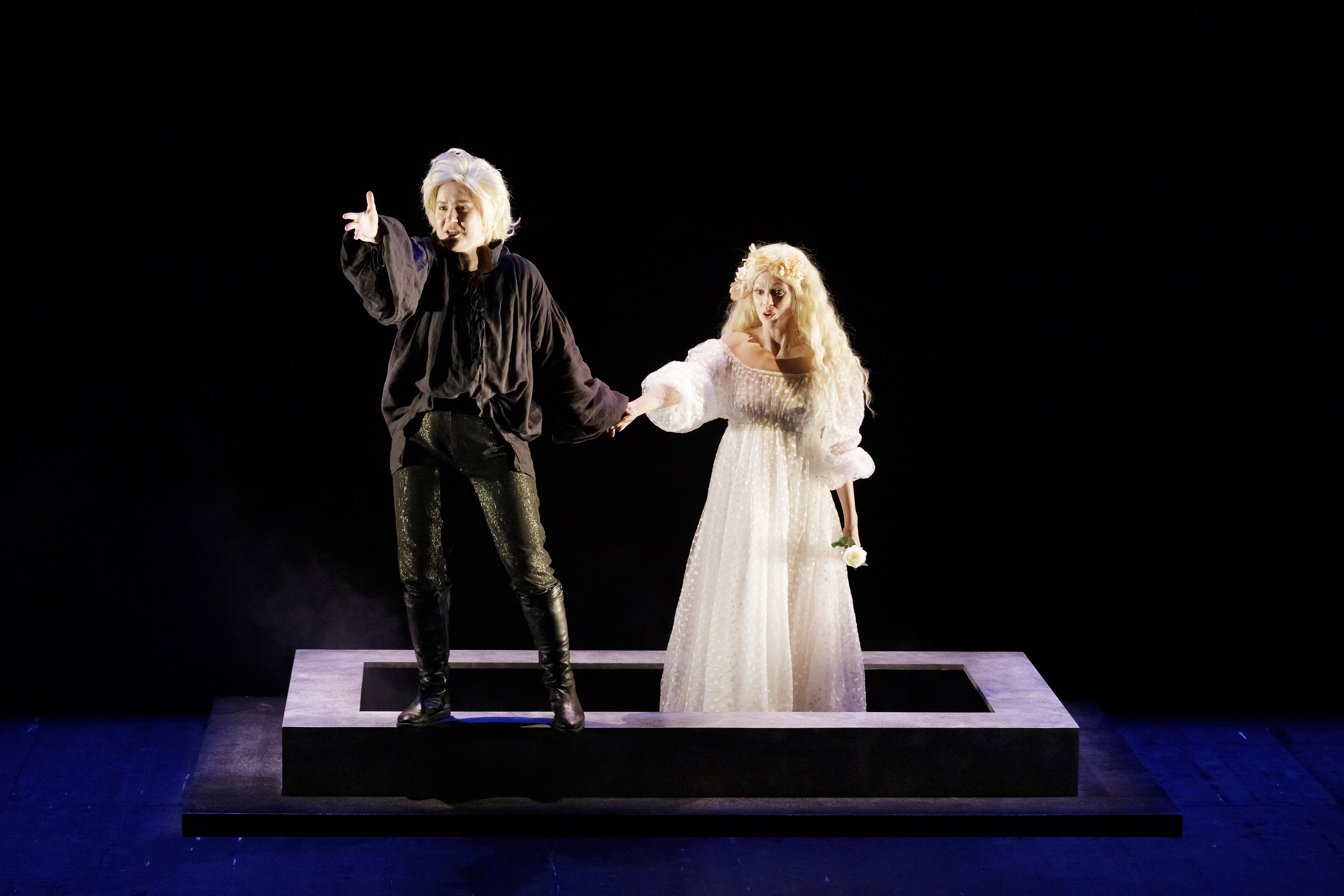 La jeune artiste paraît toutefois ne pas avoir suffisamment de profondeur dans son jeu scénique. L'expansivité de ses gestes, de ses attitudes ainsi que de ses mimiques semble quelque peu manquer de finesse dans une mise en scène qui elle n'en manque pas. Mais peut-être est-ce justement pour combler cette épuration judicieusement choisie par que l'artiste éprouve le besoin de s'approprier l'espace et l'attention du public par un jeu large et marqué ? Parce qu'avec cet Orphée et Eurydice, l'on retrouve la touche agréablement classique du metteur en scène qui préfère l'efficacité à l'extravagance. C'est donc un plateau nu qui s'exhibe – une prise de risque en soi -, où seule la tombe d'Eurydice se distingue, offrant ainsi la possibilité de l'utilisation de trappes à plusieurs reprises pour symboliser la mort et la descente aux Enfers. Quelques rideaux et plusieurs lampes torches ou autres luminaires poétiques permettent aux spectateurs de s'acclimater à d'autres atmosphères, les quelques accessoires et la direction d'acteurs étant toujours sans fioriture et bien à propos.