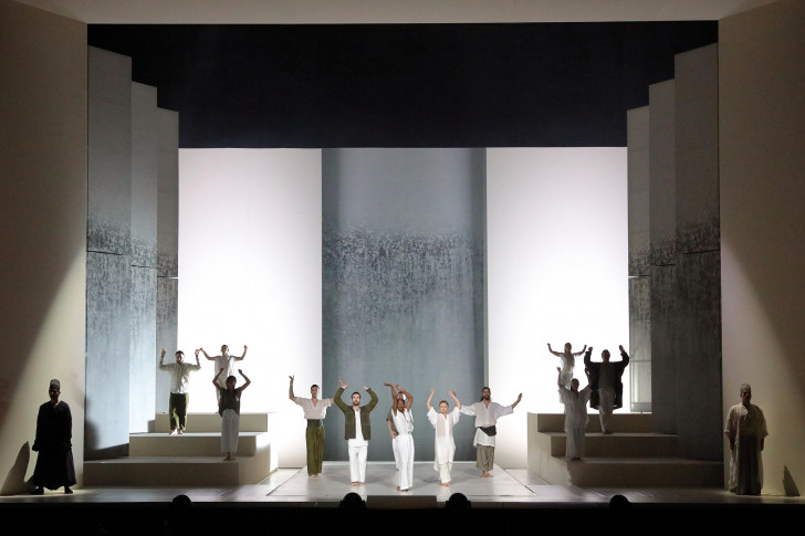 Après l'éclatante réussite de ses Indes Galantes, on pouvait avoir de fortes attentes dans la mise en scène de Sidi Larbi Cherkaoui, même si la place de la danse est naturellement moindre dans Alceste. Il propose avec les danseurs de sa compagnie Eastman un spectacle d'une belle tenue esthétique, où c'est tout le spectacle qui est en mouvement. Avec son vocabulaire chorégraphique fluide et inventif, avec son ouverture aux influences du monde entier, Cherkaoui donne au spectacle d'opéra un rythme qui n'appartient qu'à lui, et cela aurait pu suffire à obtenir une belle soirée, mais deux conditions essentielles à une telle réussite ne sont pas remplies. La première, qu'il avait satisfaite de la plus belle des façons dans Les Indes Galantes, c'est que tout ceci propose une interprétation pour un opéra qui n'est pas sans mystères. Il en avait certainement les moyens : après tout, Apollon est un dieu oriental, les rites de mort que décrit l'opéra vont chercher loin au-delà de la rationalité orientale, et l'opéra ne se laisse pas réduire à une Grèce de marbre et de soleil (le décor du spectacle, lui, ne va pas chercher beaucoup plus loin). Ce n'est pas la seule piste possible, mais celle-là aurait sans doute pu lui convenir : le problème n'est pas qu'il ne l'ait pas suivie, mais qu'il n'en ait suivie aucune.
