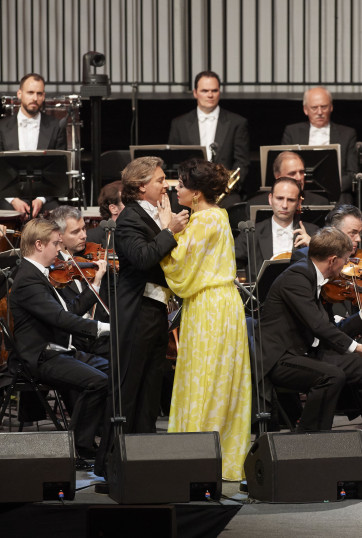 Puis Tomas Konieczny fait son entrée. Présent lui aussi en ce moment à Vienne pour chanter Danton dans l'ouvrage de Gottfried von Einem, il porte ce soir Ha, welche in Augenblick extrait du Fidelio de Beethoven, avec une superbe puissance, également présente dans les cordes de l'orchestre, dirigé d'une main de maître toute la soirée par Marco Armiliato. Puis on tourne la tête à gauche, car Jongmin Park apparait en haut de l'opéra, d'où il tient les graves de Macbeth avec l'air Come dal ciel precipita. Verdi est à la fête avec le Chor der Wiener Staatsoper pour Va, pensiero, célèbre morceau de Nabucco. Verdi encore avec Ferruccio Furlanetto dans un extrait des Vêpres Siciliennes, puis Roberto Alagna et sa femme Aleksandra Kurzak, que le ténor n'oublie pas d'embrasser dans un splendide duo d'amour d'Otello, vu récemment à Paris, alors qu'il triomphe en ce moment à Londres en Andréa Chénier.