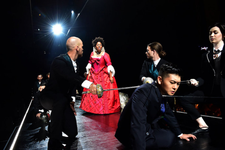 Au sein d'une équipe en complet veston, la Didon de Lotte de Beer est la seule à changer de costume et d'époque à chacune de ses apparitions. Est-ce le désir de faire du drame amoureux de la Reine de Virgile le drame de tout humain? Ou alors la variété de cette garde-robe à travers les âges, qui a donné à la metteuse en scène l'idée de faire évoluer tous les protagonistes du drame au plus près des spectateurs, sur un plateau qui, tendu entre scène et salle, rappelle celui des défilés de mode ? L'espace de jeu est donc une longue bande noir de jais déroulée des planches au fond du parterre entre deux volées d'escaliers, qui enjambe la fosse d'orchestre et traverse tout le théâtre. Des néons surlignent au sol comme au plafond ce plateau insolite à l'Opéra. Le public, ainsi chassé de son fauteuil habituel, se voit divisé en quatre groupes de part et d'autre de ce plateau devenu podium, accès aux premier et deuxième balcons exceptionnellement condamnés. En contrebas de cette ligne de démarcation officient cheffe et orchestre d'un côté, huit figurants à tout faire (et à fière allure) de la cour de Didon.