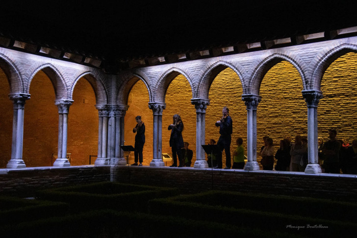 La thématique de cette année caractérise l'audace de l'équipe : autant prendre comme fil conducteur le contrepoint, le mode de composition musicale le plus complexe, afin de se simplifier la tâche ! Dans L'Offrande musicale, le résultat est époustouflant malgré les quelques petites fausses notes de cette création spécialement montée pour le festival. Peu importe l'attente pour constituer les deux équipes de la soirée, peu importent les quelques couacs des solistes de l'ensemble baroque dont les instruments anciens fragiles – particulièrement les instruments à vent – sont quelques peu malmenés sous la douceur du soir, peu importe la construction en quatre temps un peu longue pour des spectateurs bien déstabilisés par cette proposition créative… C'est en effet une déambulation sous les étoiles au sein du superbe couvent des Jacobins dans laquelle la mise en scène d'Andréas Linos se déploie.